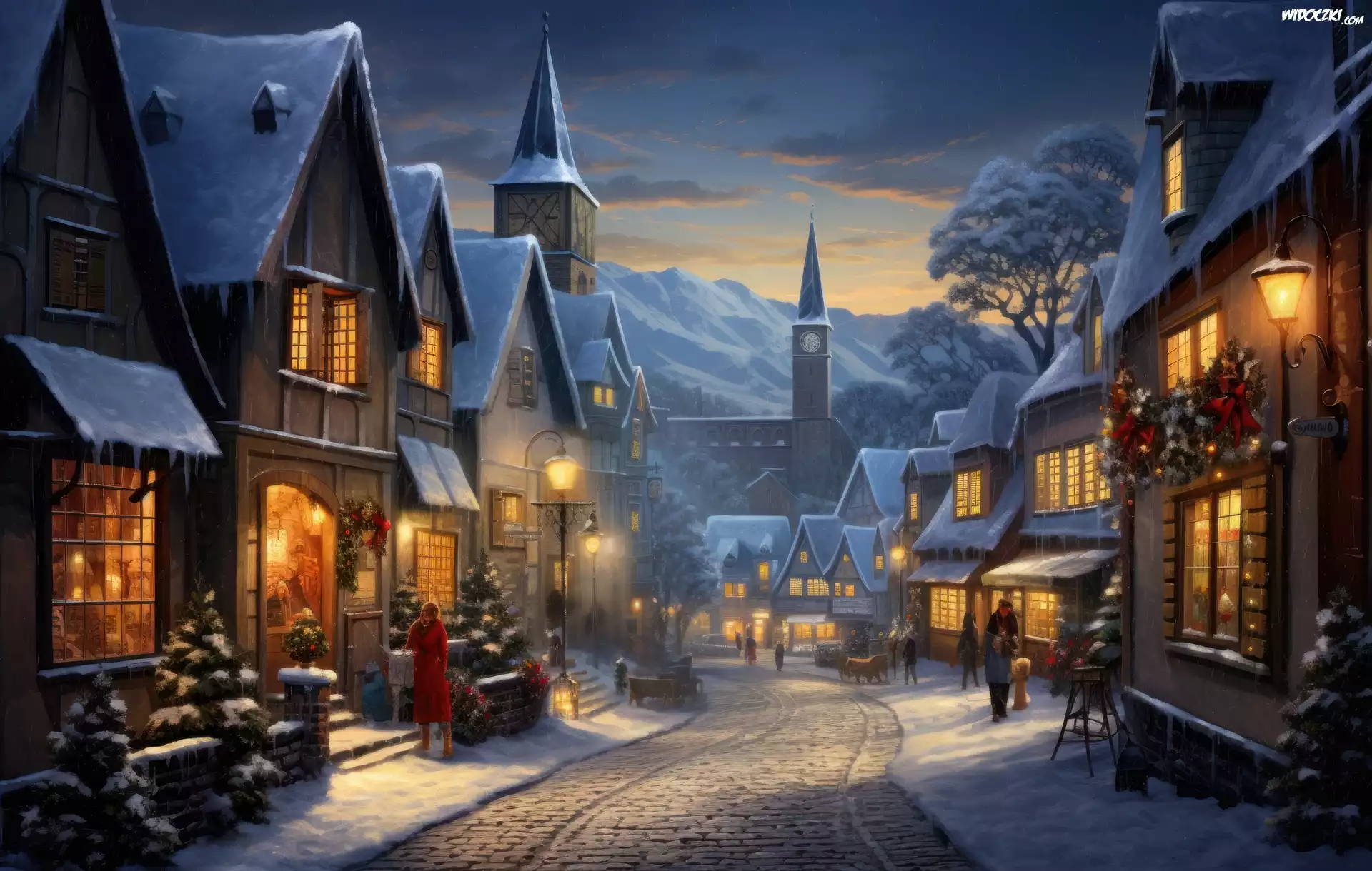 Zima, Góry, Domy, Ulica, Ludzie, 2D