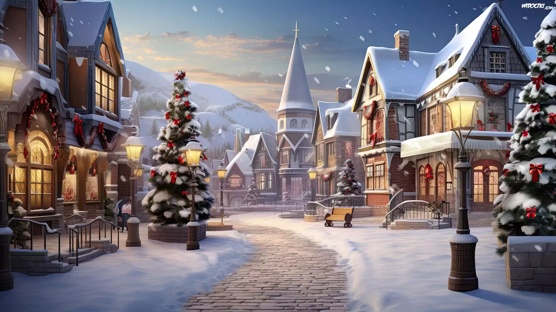 Zdjęcia, Zima, Boże Narodzenie, Ulica, Domy, Choinki