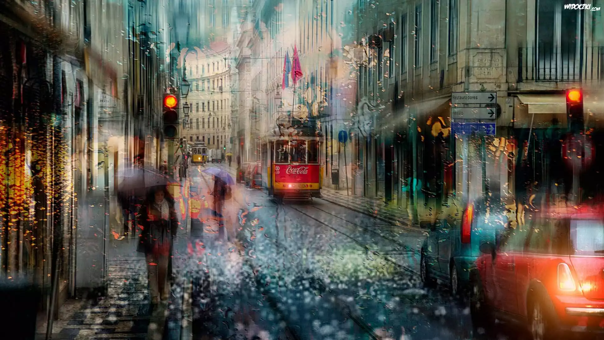 Zdjęcia, Ulica, Deszcz, Kamienice, Tramwaje, Kobieta, Parasol