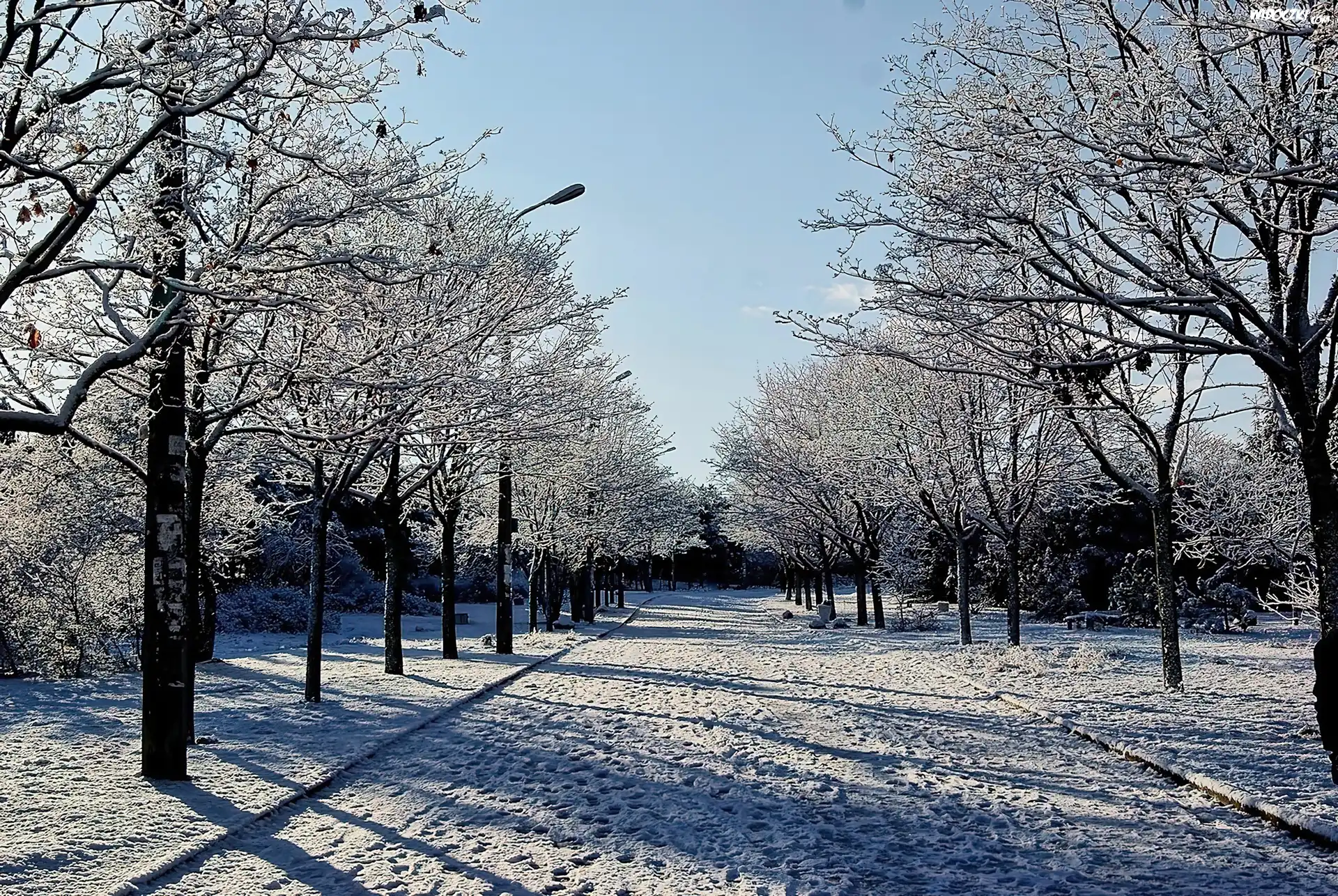 Zdjęcia, Ulica, Ośnieżone, Drzewa, Światło, Cień