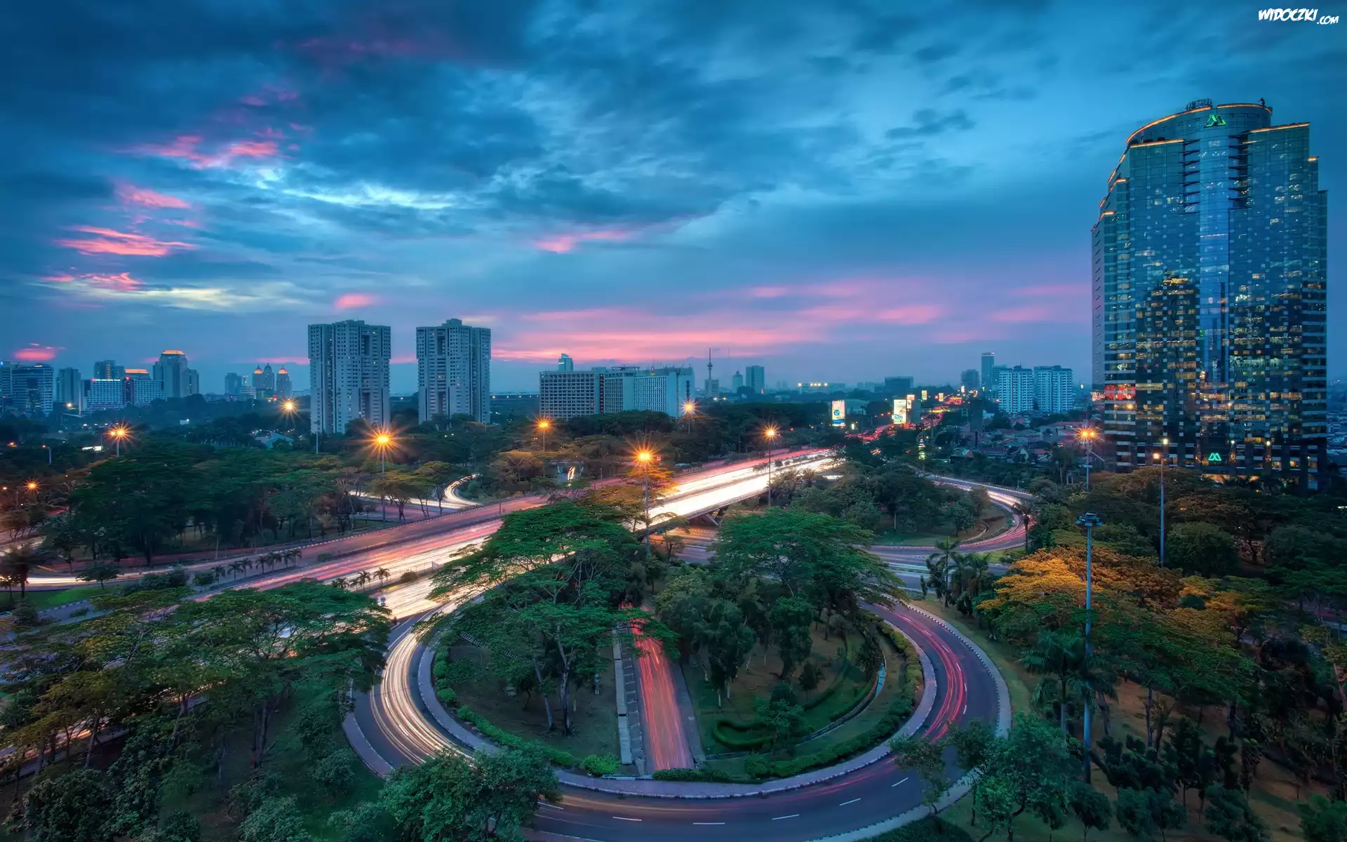 Zdjęcia, Wieżowce, Ulice, Drzewa, Dżakarta, Stolica, Jndonezji, Zachód, Słonca