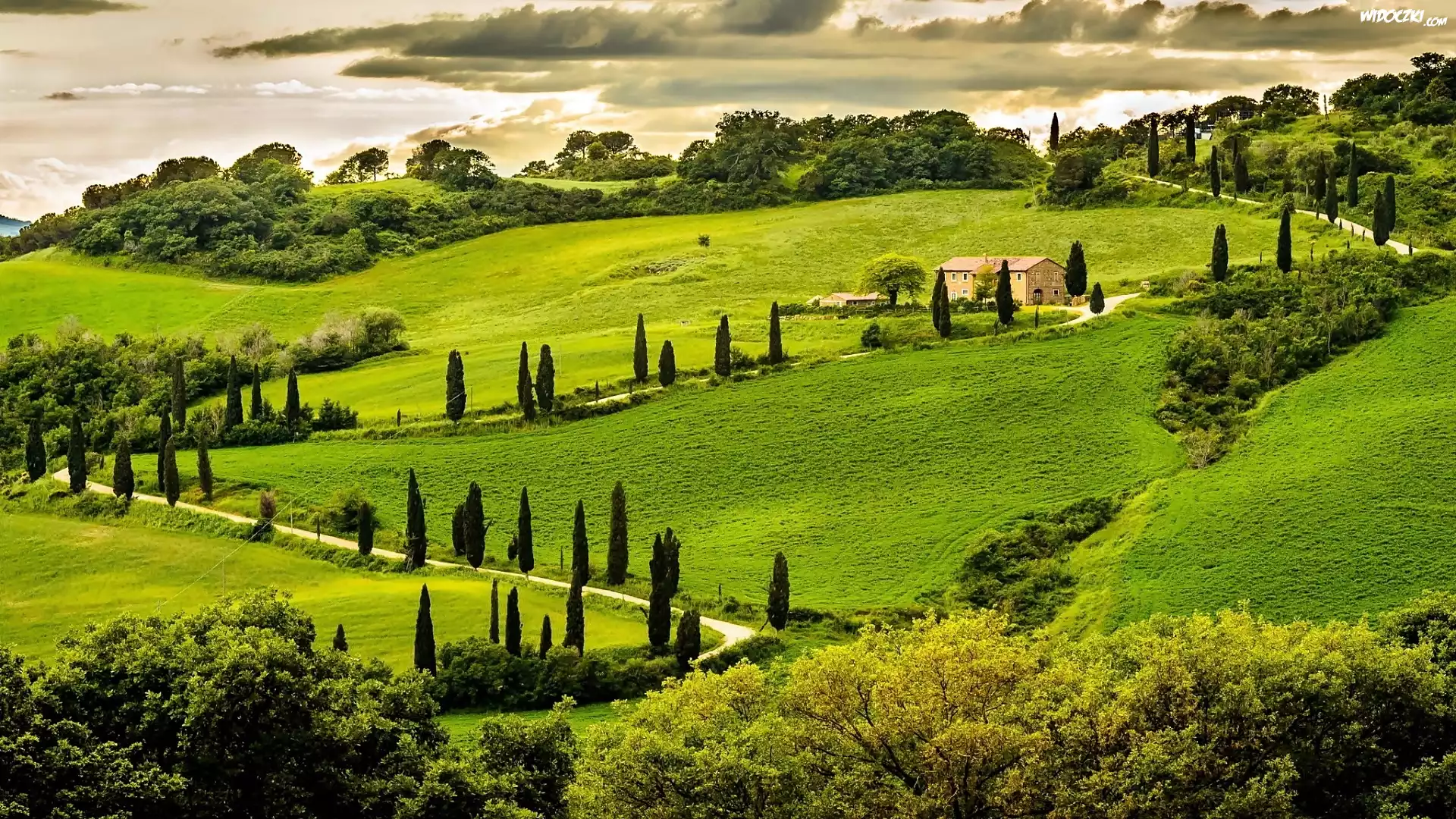 Zdjęcia, Umbria, Wzgórza, Dom, Pola, Droga, Drzewa