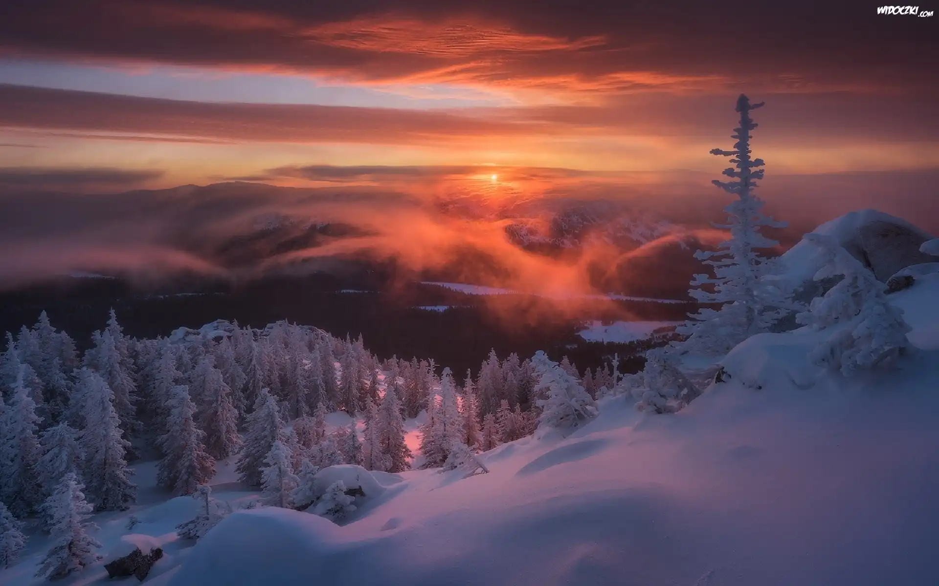 Zdjęcia, Rosja, Góry Ural, Park Narodowy Taganaj, Zima, Wschód słońca, Ośnieżone, Drzewa