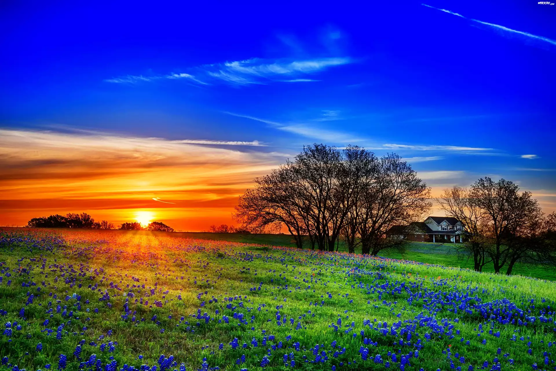 Farma, Drzewa, Łąki, Szafirki, Wschód, Słońca, Wiosna, Texsas, USA