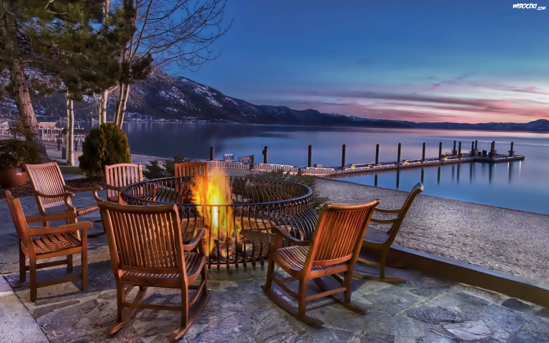 Zdjęcia, Jezioro Tahoe, Molo, Ognisko, Kurort, Góry, Sierra Nevada, Zmierzch, USA