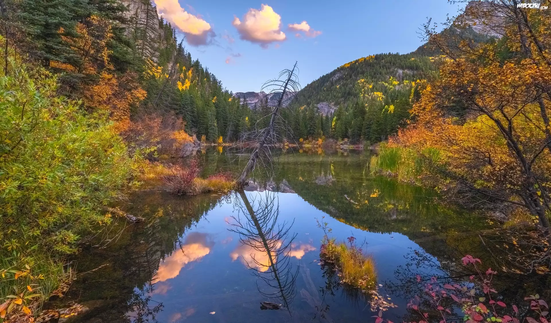 Góry, Jezioro, Drzewa, Uschnięte, Drzewo, Jesień