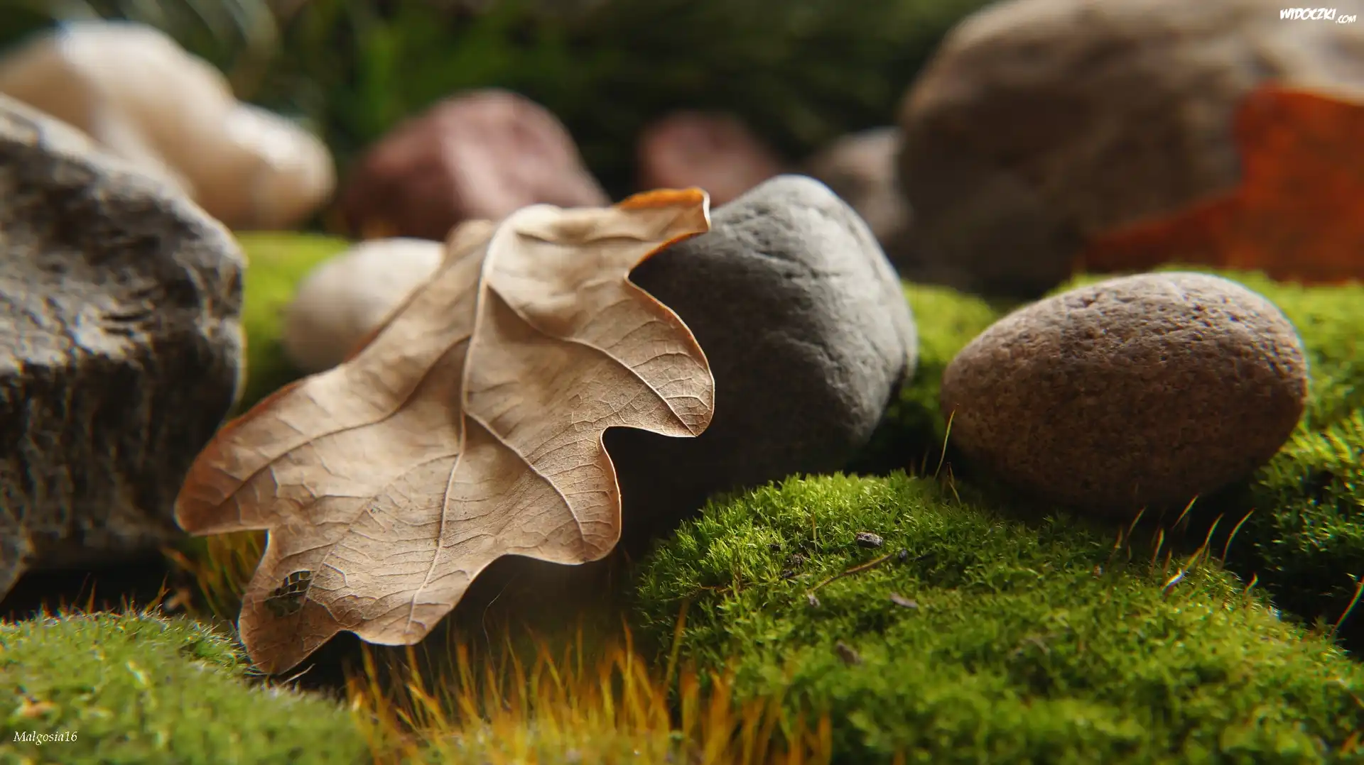 Zdjęcia, Uschnięty, Liść, Mech, Kamienie