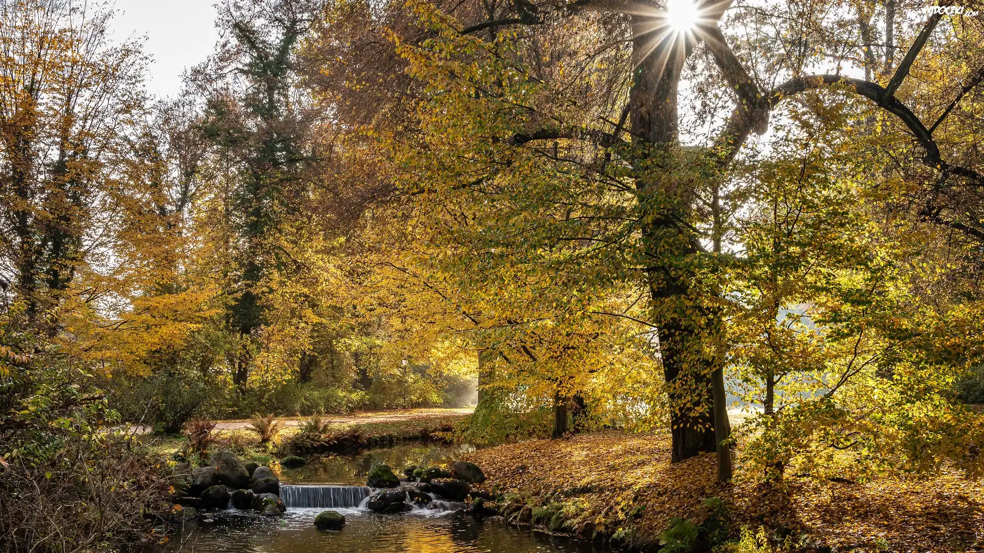 Zdjęcia, Jesień, Drzewa, Rzeka, Uskok, Liście, Słońce