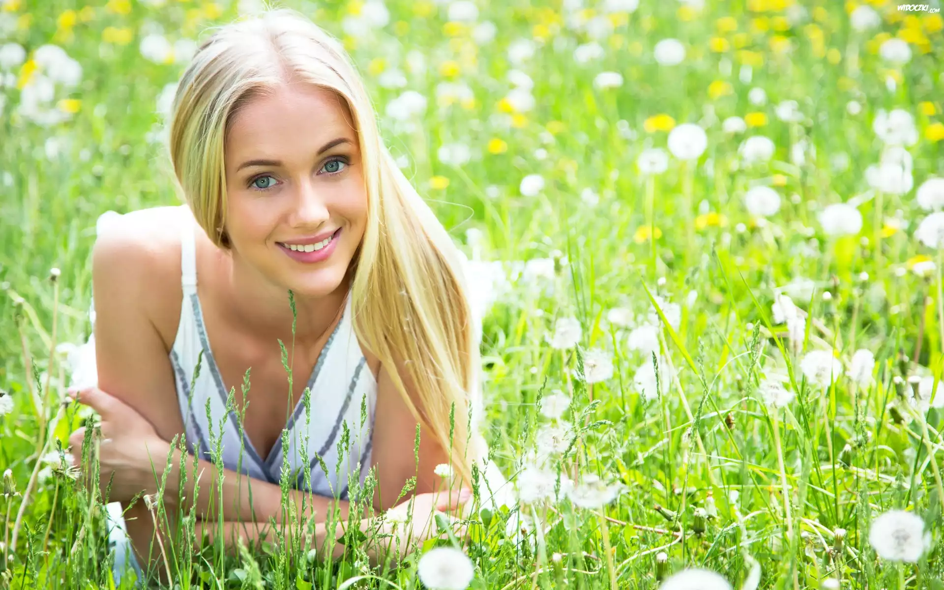 Uśmiechnięta, Blondynka, Łąka, Mlecze