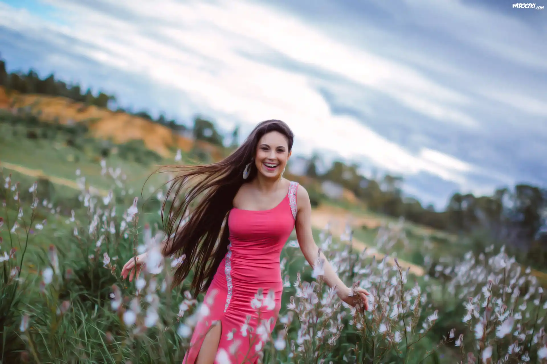 Zdjęcia, Uśmiechnięta, Kobieta, Białe, Kwiaty
