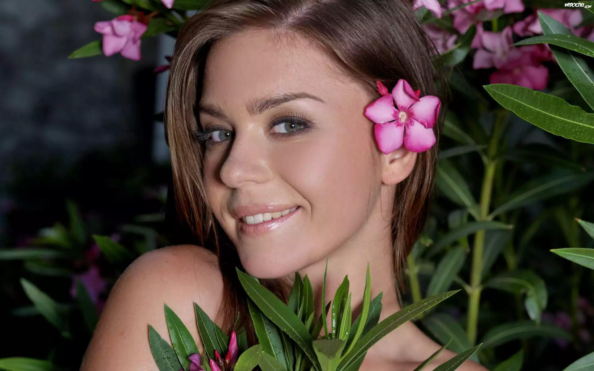 Zdjęcia, Uśmiechnięta, Kobieta, Ogród, Kwiaty