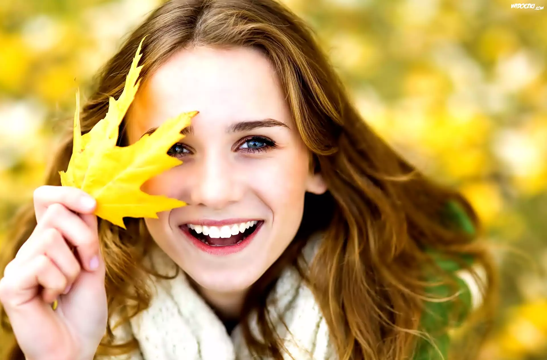 Zdjęcia, Uśmiechnięta, Kobieta, Żółty, Liść