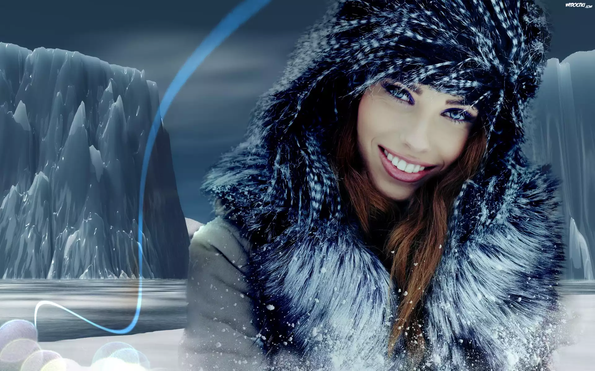 Zdjęcia, Uśmiechnięta, Kobieta, Zima, Makijaż