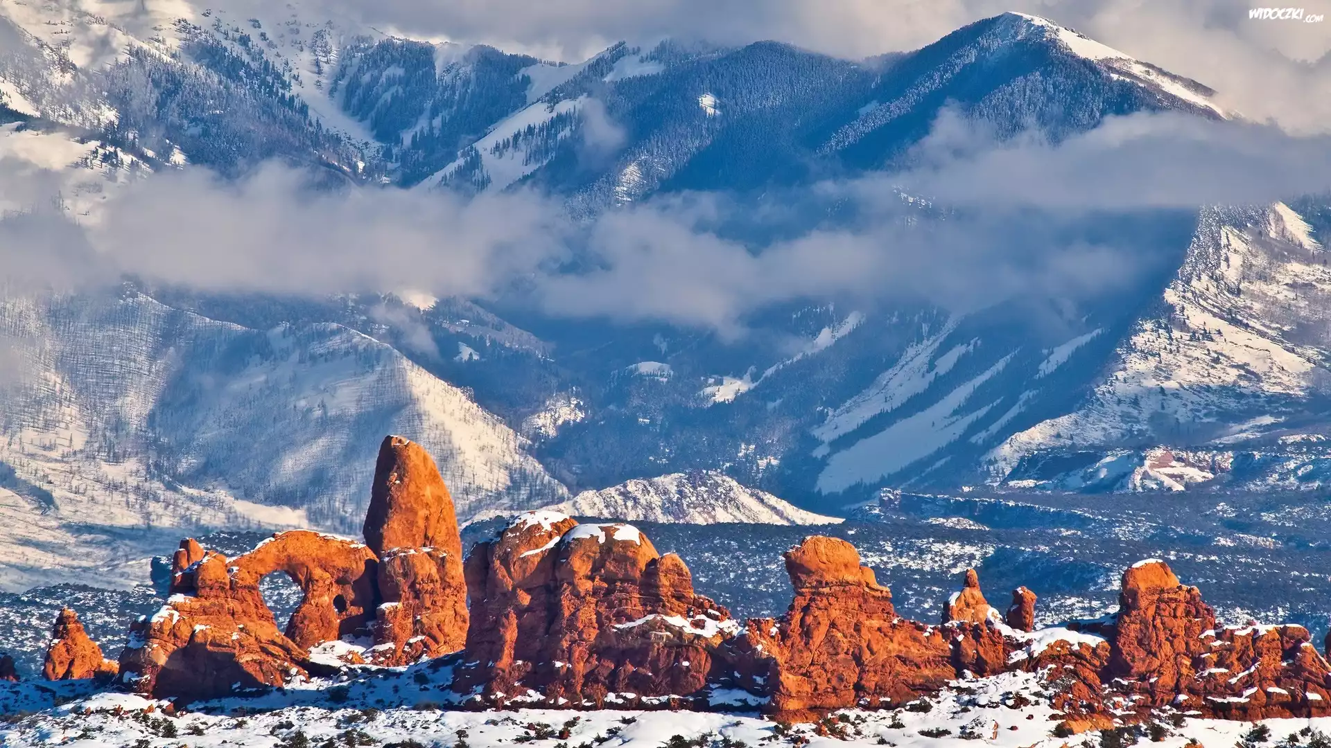 Zima, Zalesione, Ośnieżone, Góry, Brązowe, Skały, Pasmo Górskie, Utah, Park Narodowy Arches, Stany Zjednoczone |