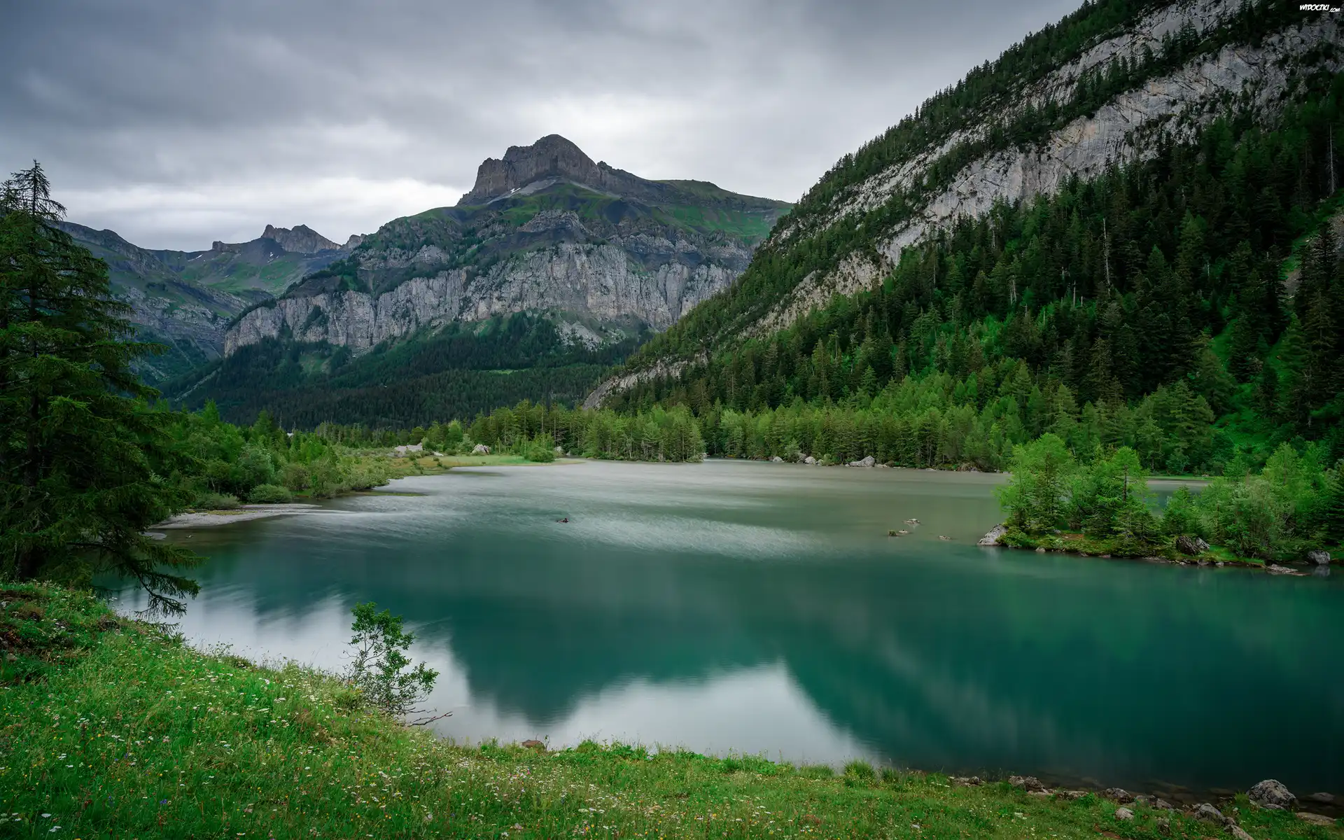 Zdjęcia, Szwajcaria, Kanton Valais, Góry, Alpy Berneńskie, Jezioro, Lac de Derborence, Lasy