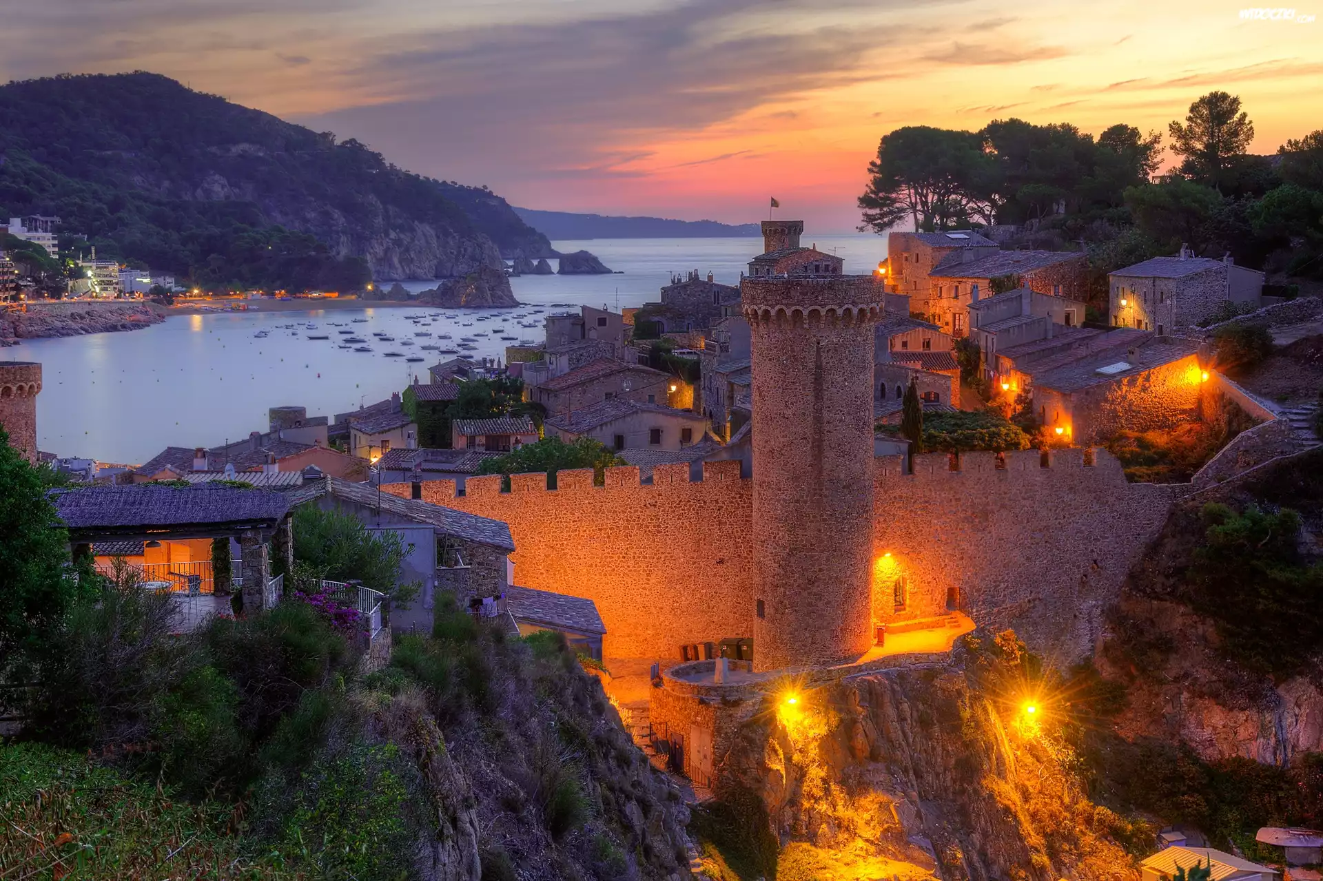 Vila Vella, Mury obronne, Światła, Domy, Góry, Morze, Świt, Tossa de Mar, Prowincja Girona, Hiszpania |