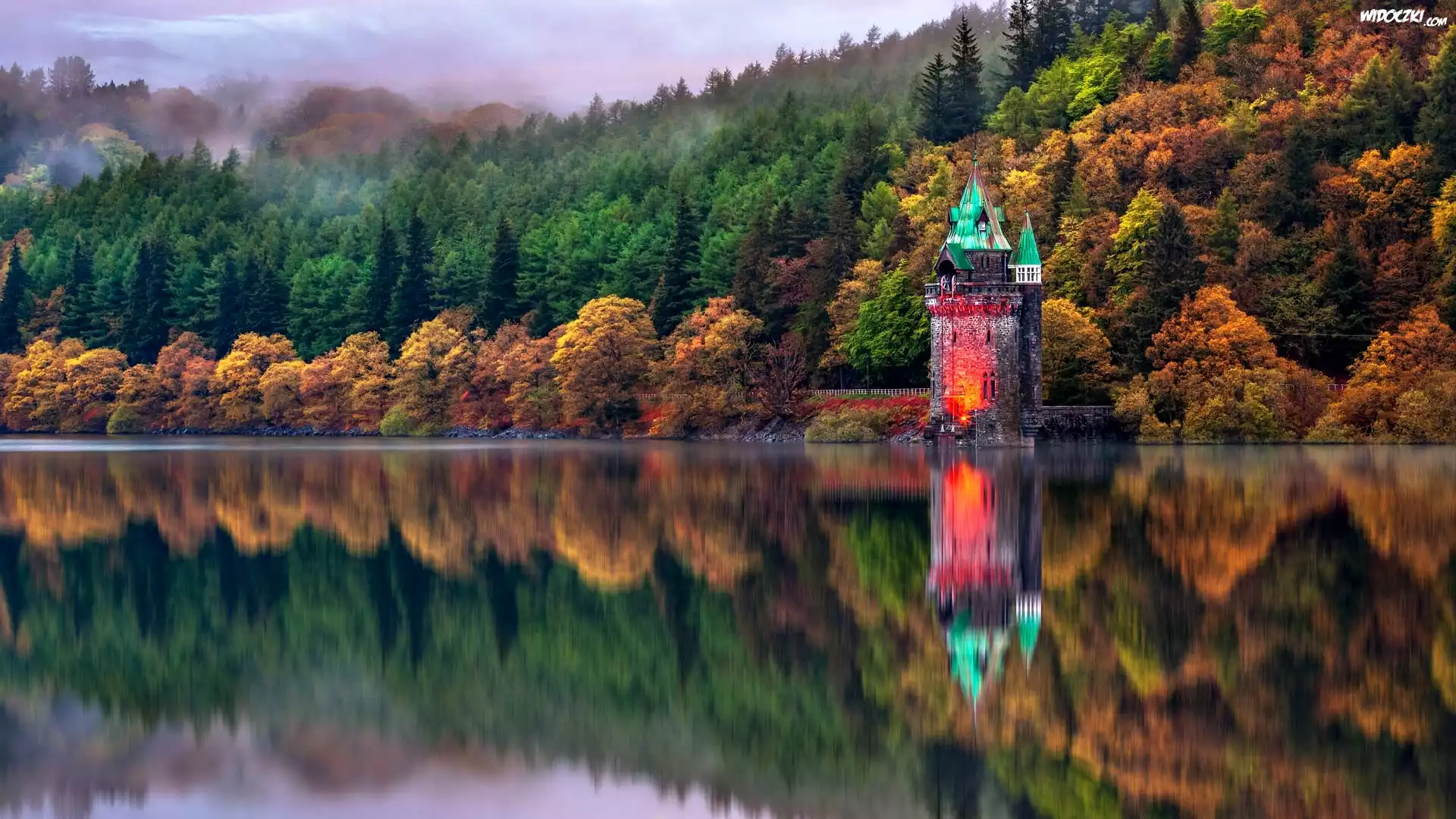 Zdjęcia, Walia, Hrabstwo Powys, Jezioro Lake Vyrnwy, Budowla, Wieża ciśnień, Jesień, Drzewa, Lass