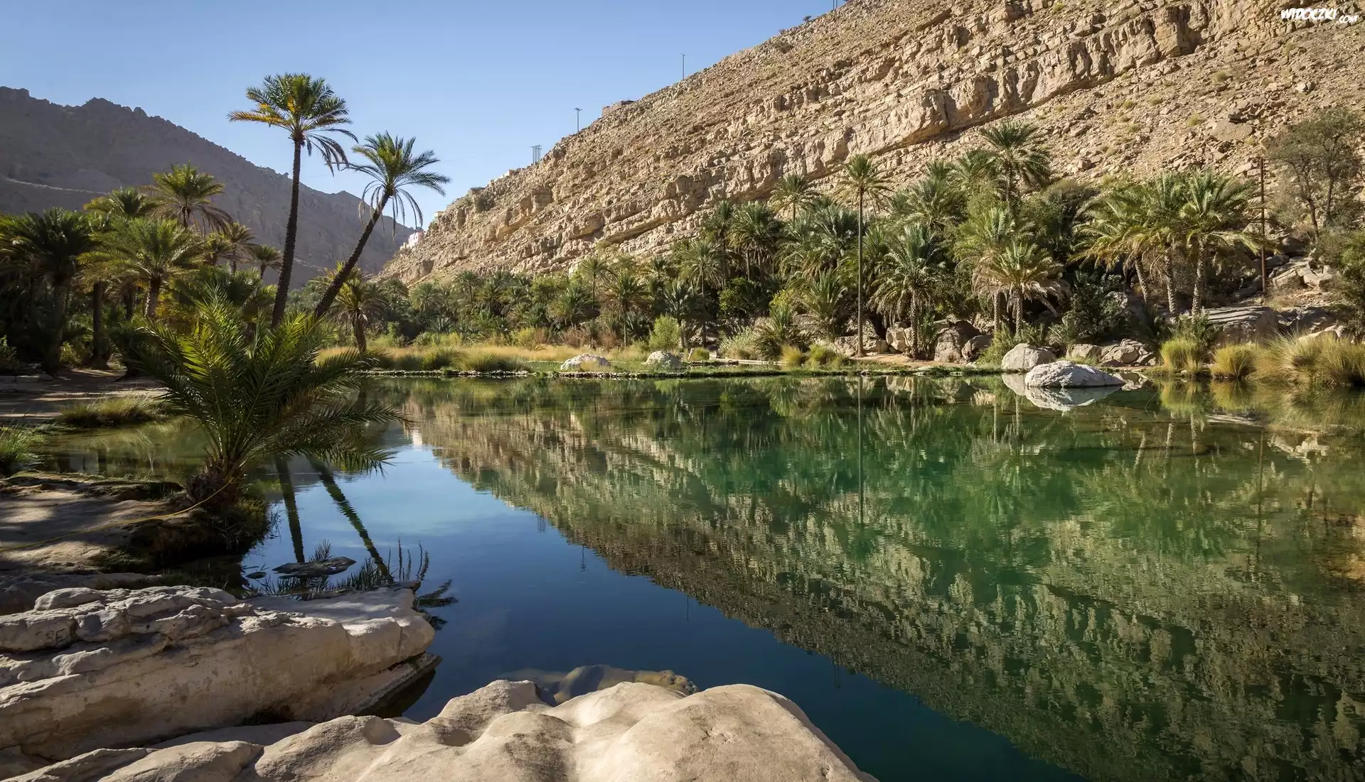 Zdjęcia, Oman, Wadi Bani Khalid, Staw, Góry, Palmy, Odbicie
