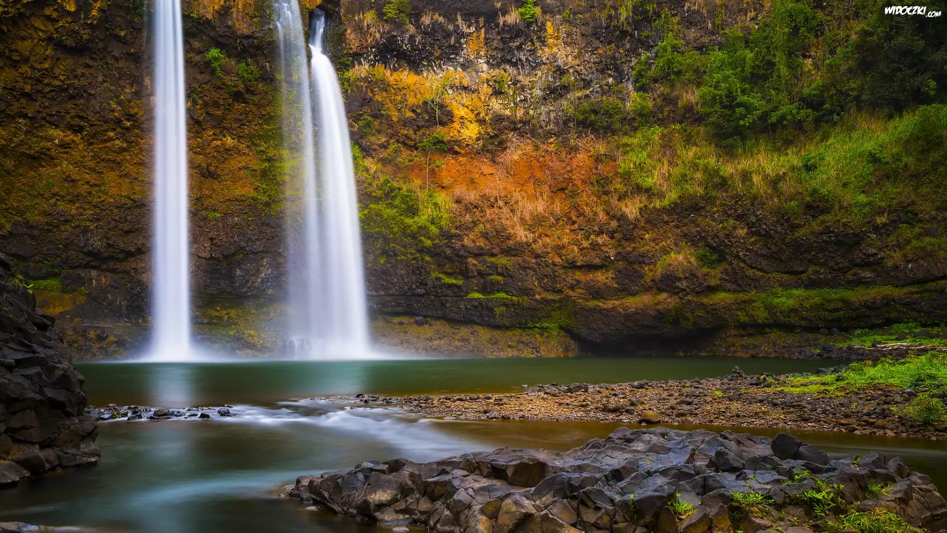 Zdjęcia, Wodospad Wailua Falls, Skała, Roślinność, Rzeka, Kauai, Hawaje