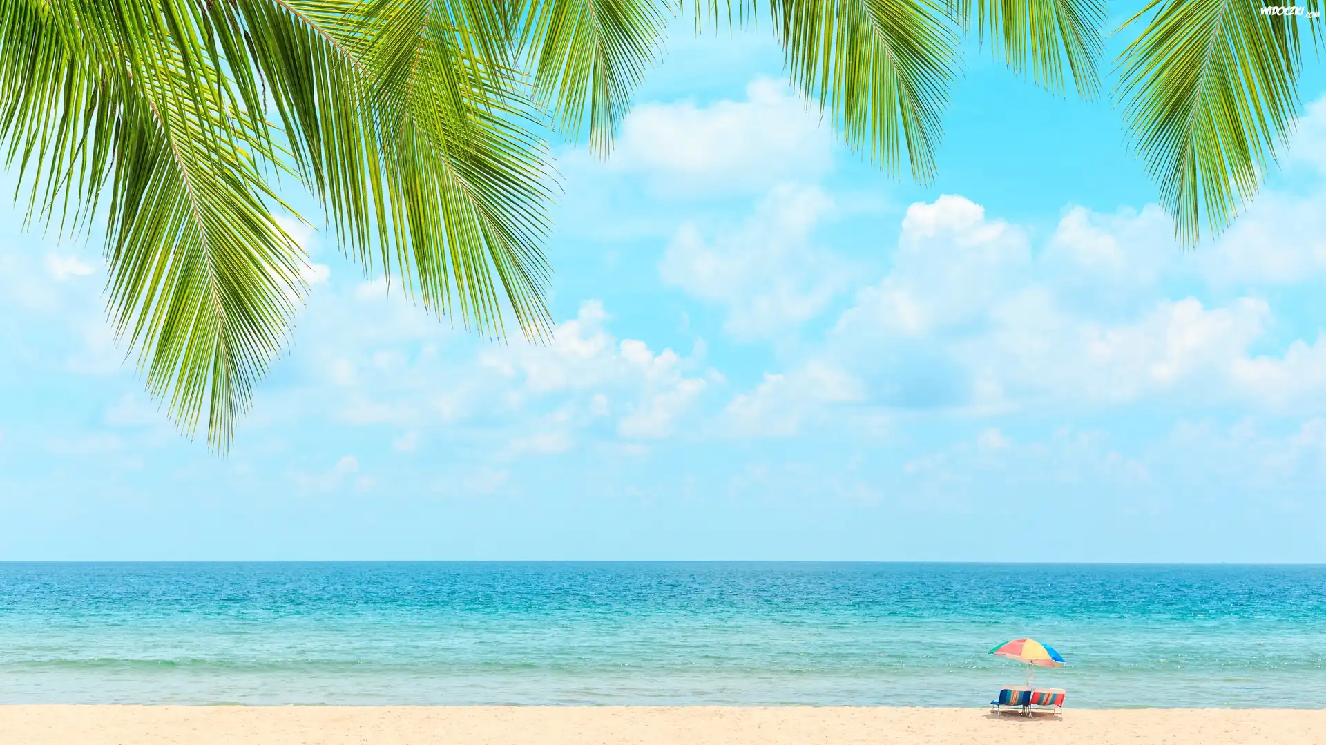 Morze, Plaża, Leżaki, Parasol, Niebo, Chmury, Liście, Palmy, Wakacje