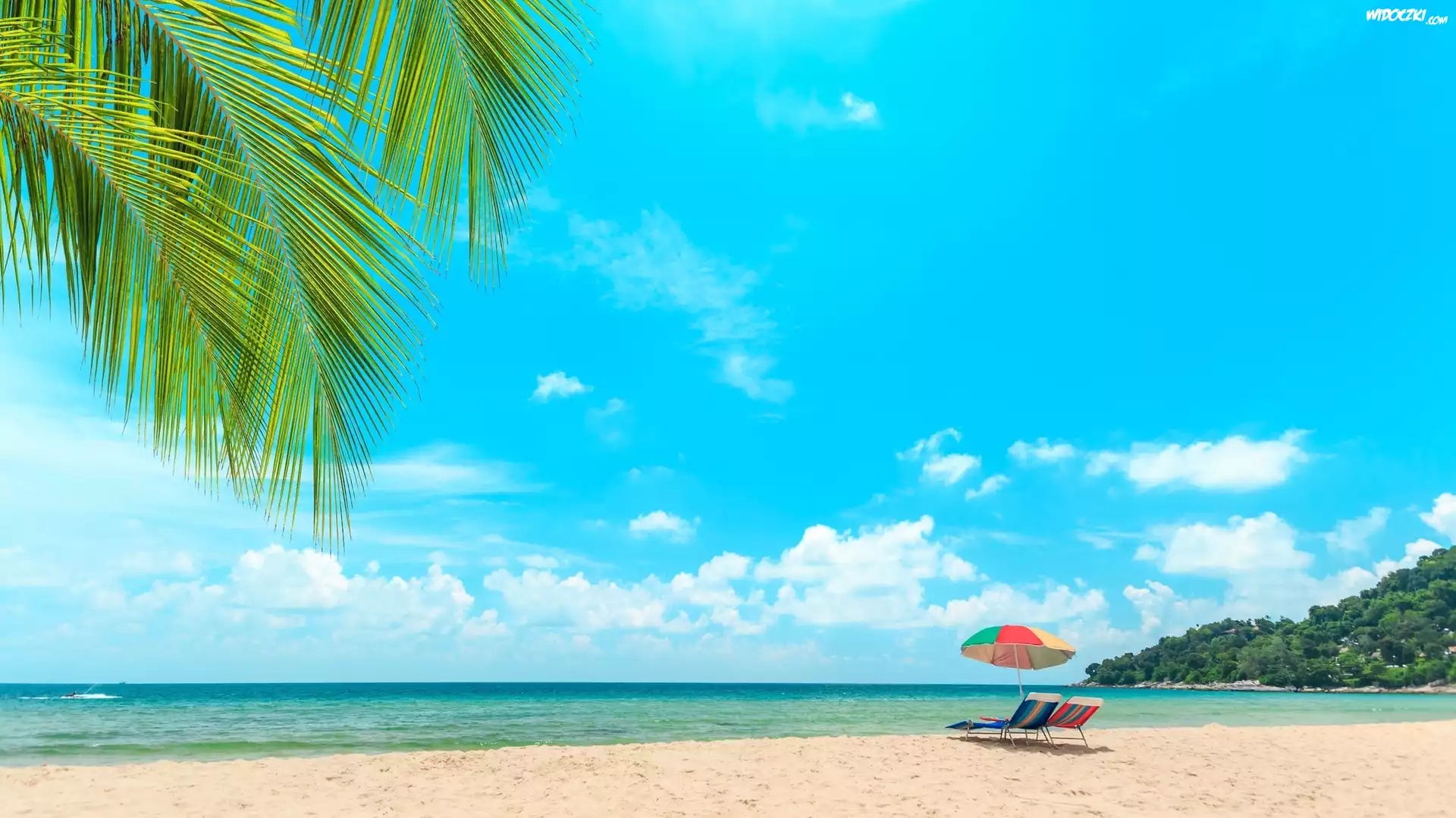 Zdjęcia,  Morze, Plaża, Leżaki, Parasol, Niebo, Chmury, Liście, Palmy, Wakacje