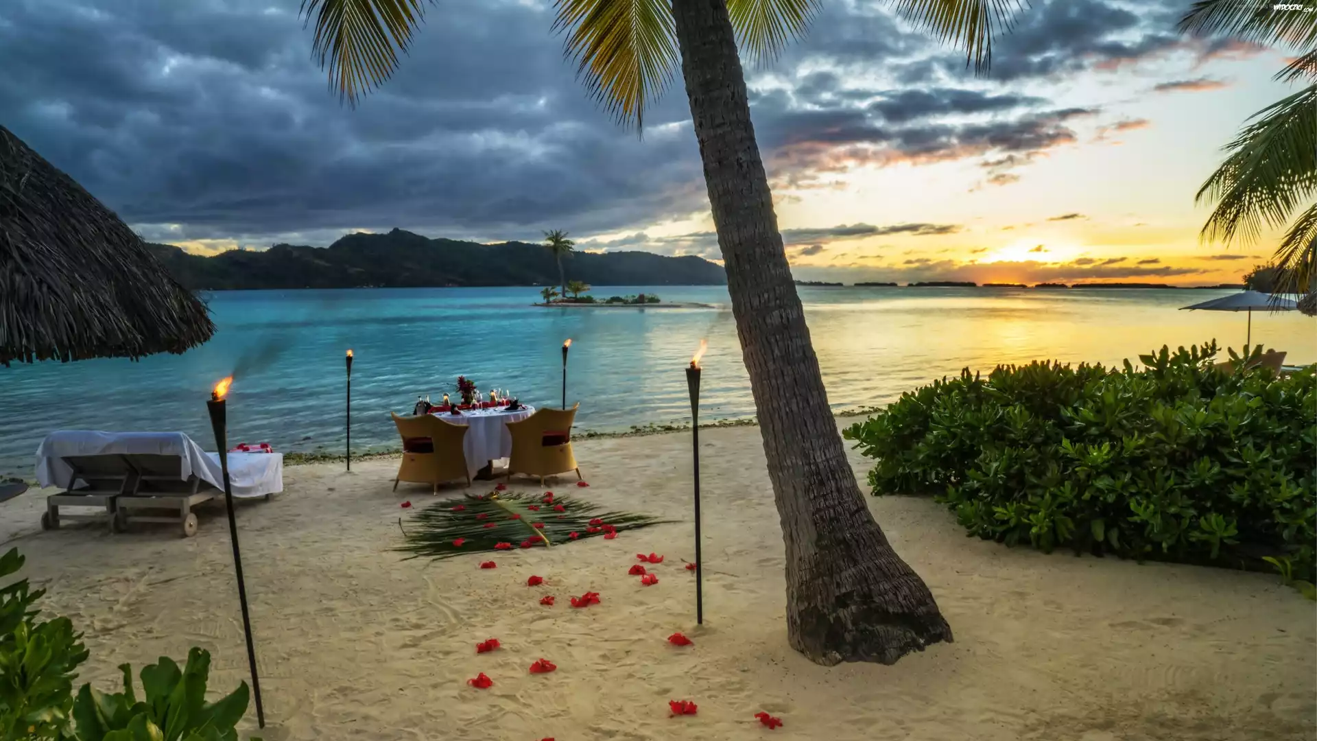 Morze, Zachód słońca, Wzgórza, Palmy, Leżak, Stolik, Chmury, Wakacje