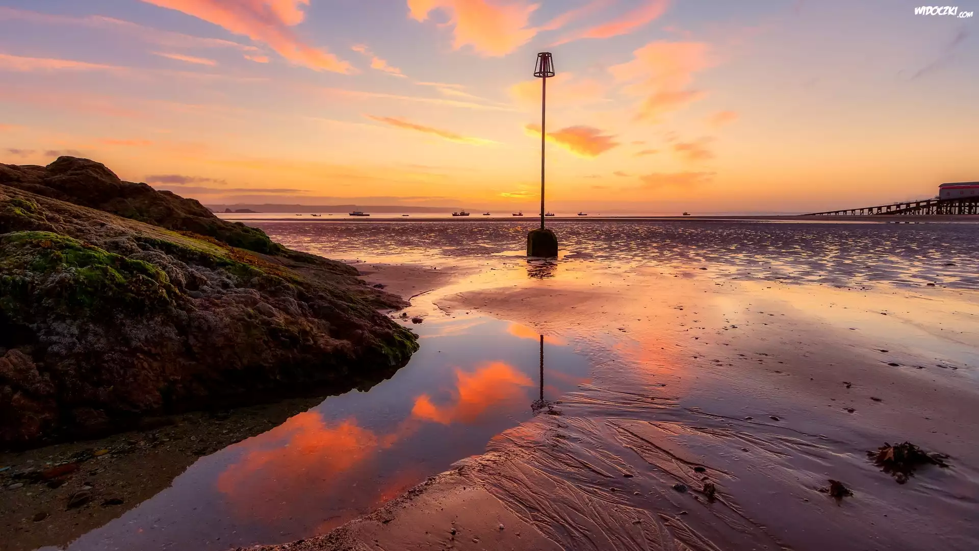 Zdjęcia, Plaża, Skała, Wschód słońca, Zatoka Carmarthen, Tenby, Hrabstwo Pembrokeshire, Walia