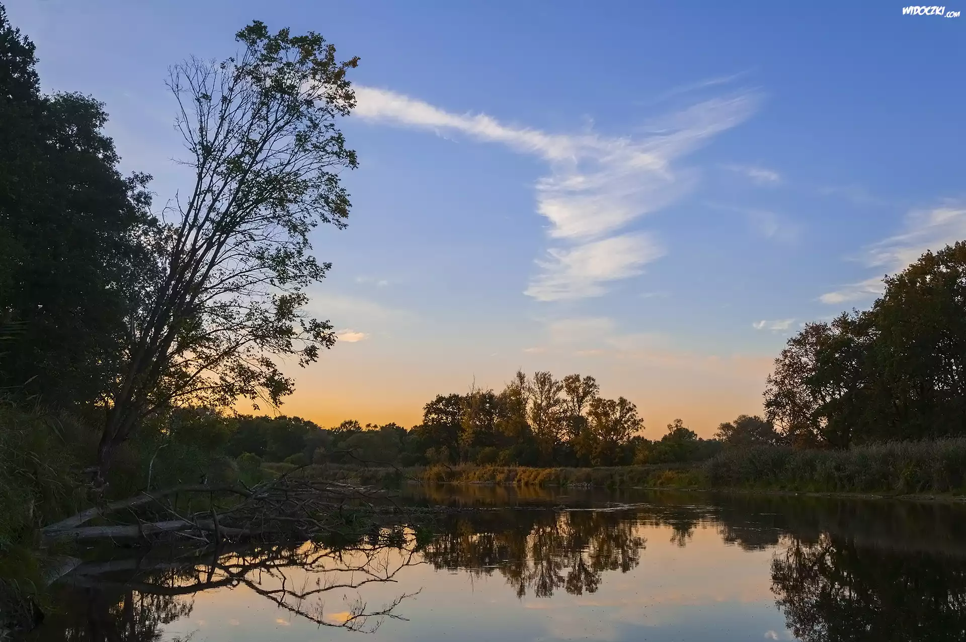 Rzeka, Warta, Drzewa, Zachód słońca, Niebo, Chmura