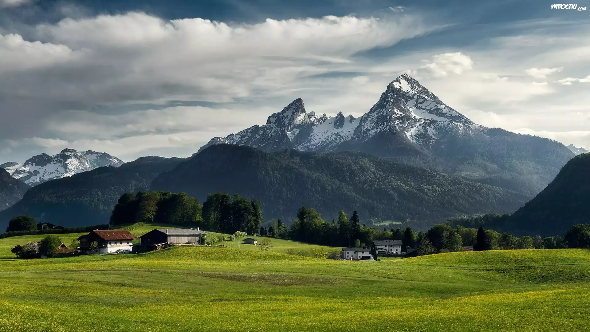 Zdjęcia, Góry, Masyw Watzmann, Lasy, Drzewa, Domy, Chmury, Gmina Berchtesgaden, Bawaria, Niemcy