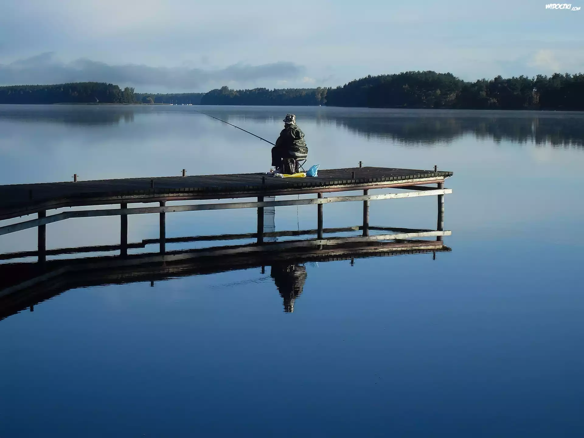Zdjęcia, Wędkarz, Jezioro, Pomost, Mgła, Las