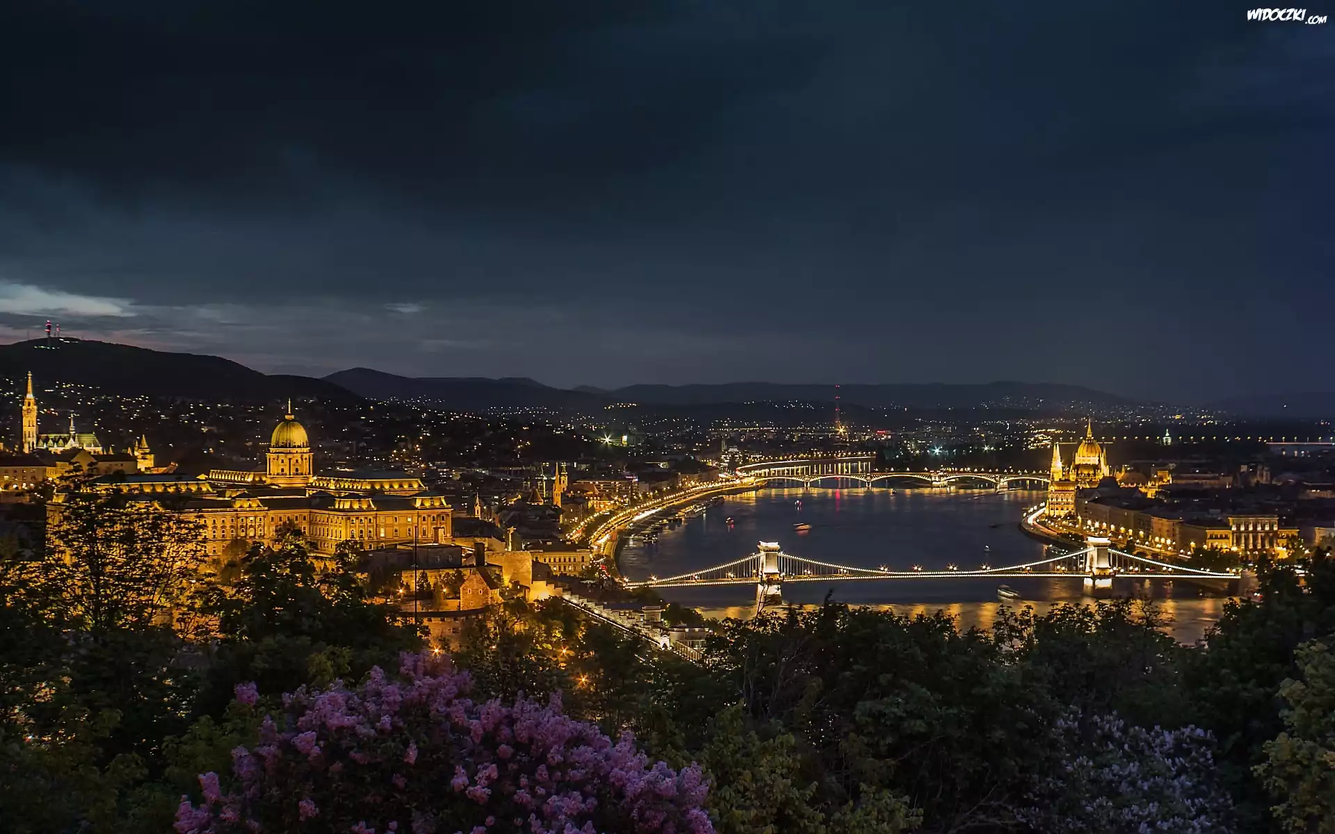 Węgry, Budapeszt, Miasto, Nocą, Rzeka, Most