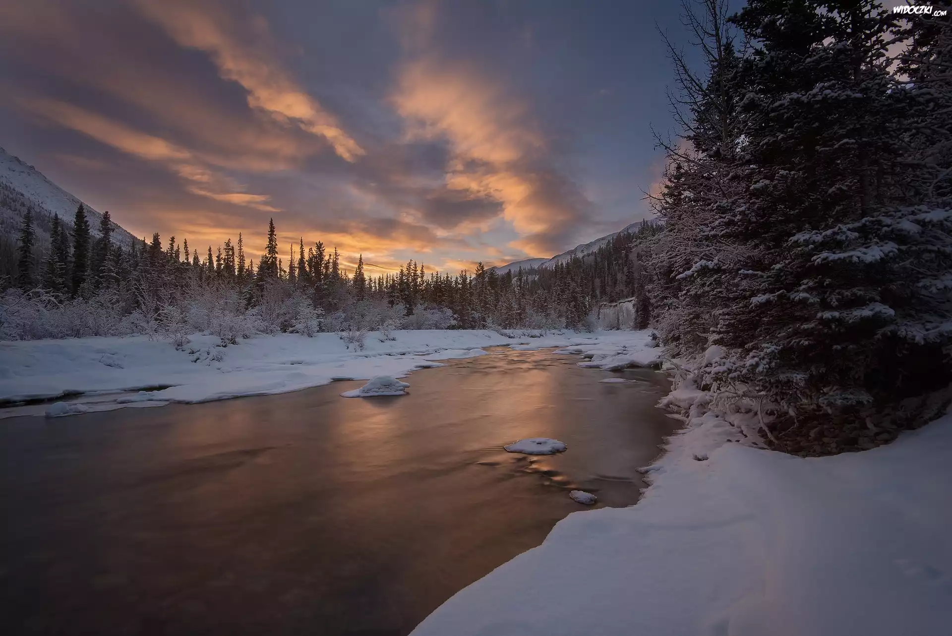 Kanada, Yukon, Wheaton Valley, Wheaton River Wilderness Retreat, Rzeka, Zima, Śnieg, Drzewa, Zachód słońca |