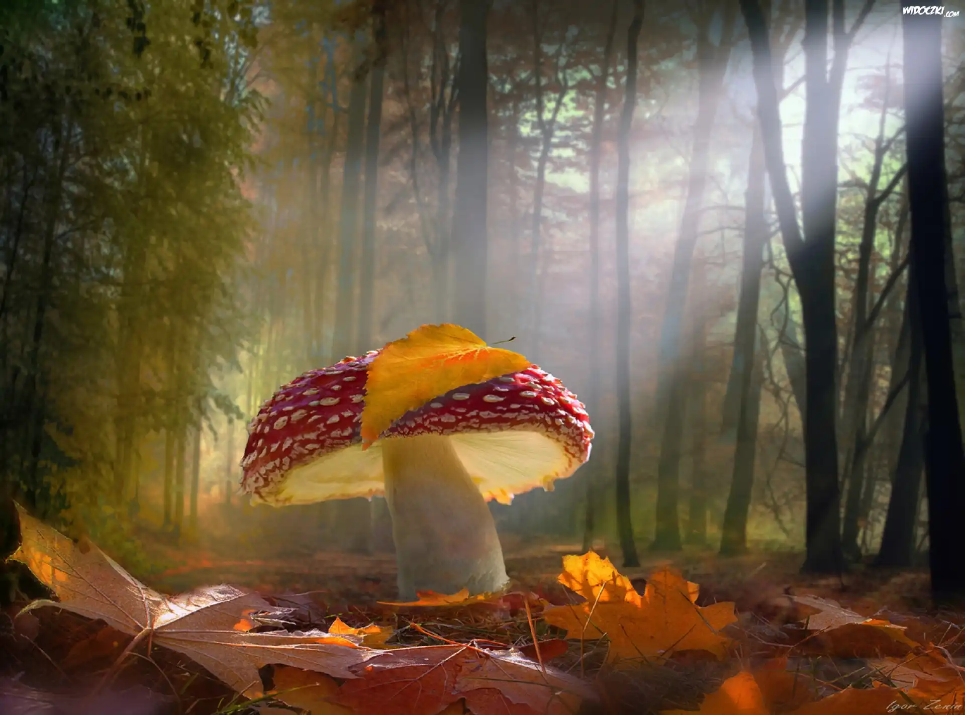 Zdjęcia, Przebijające, Światło, Las, Drzewa, Liście, Grzyb, Muchomor