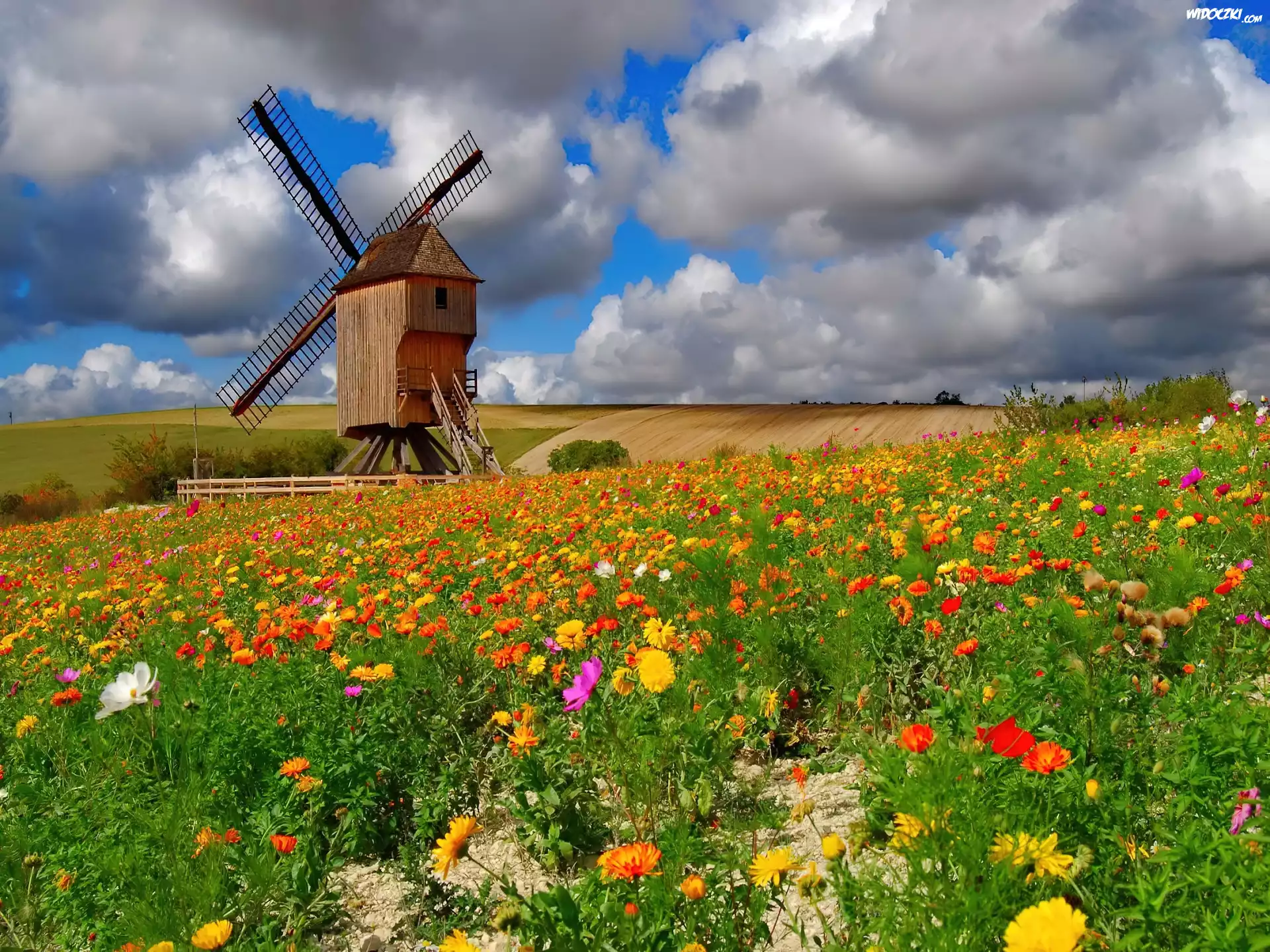Zdjęcia, Łąka, Wiatrak, Kwiaty