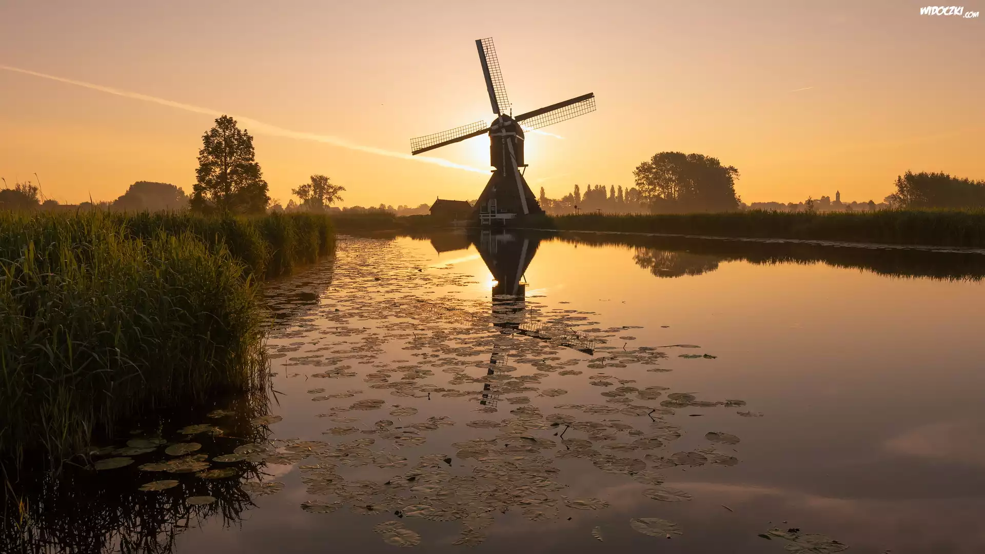 Wiatrak, Młyn Oudendijkse Molen, Rzeka Giessen, Kanał, Lilie wodne, Wschód słońca, Overslingeland, Holandia |