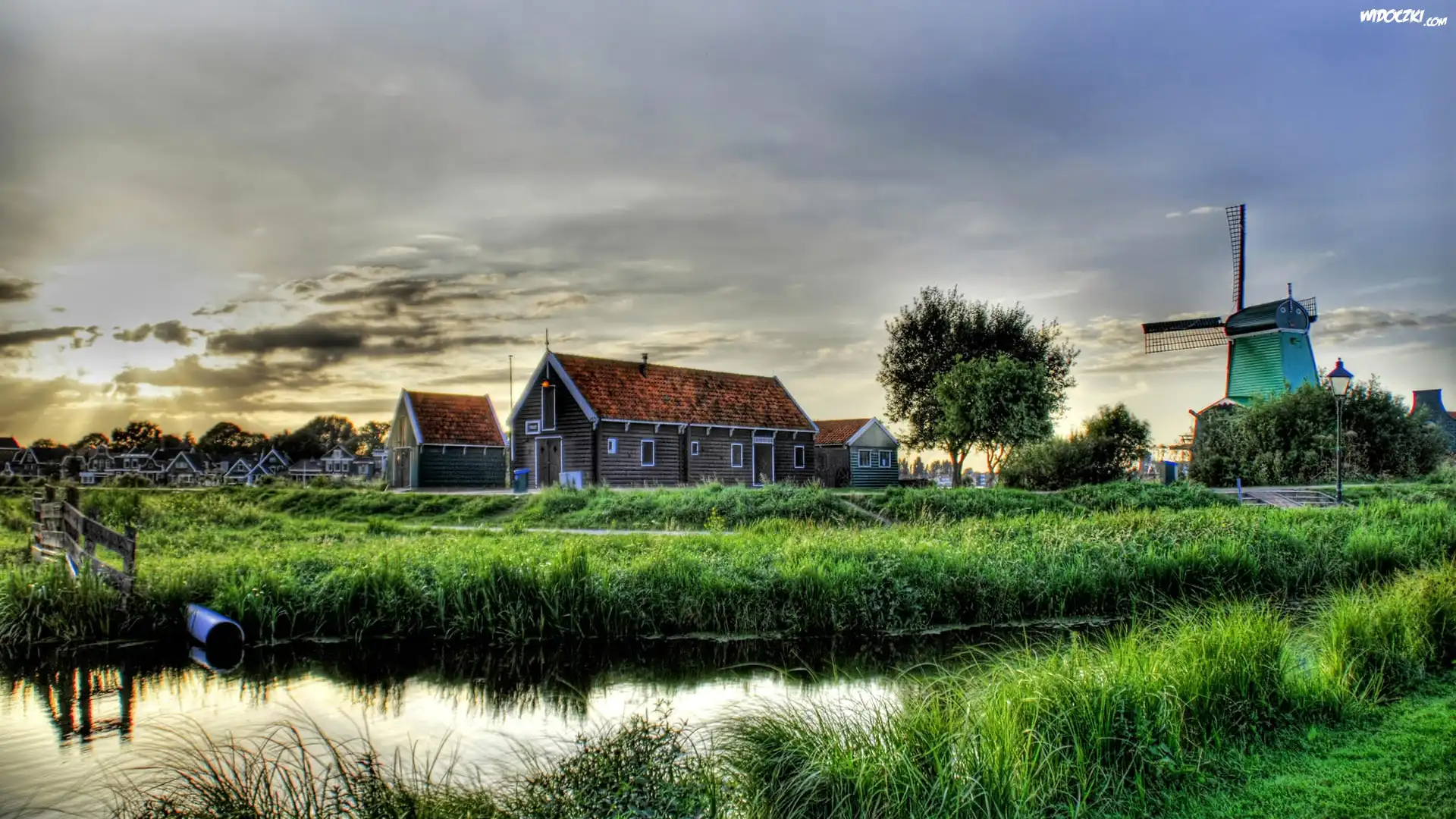 Zdjęcia, Wiatrak, Domy, Rzeczka, Trawy