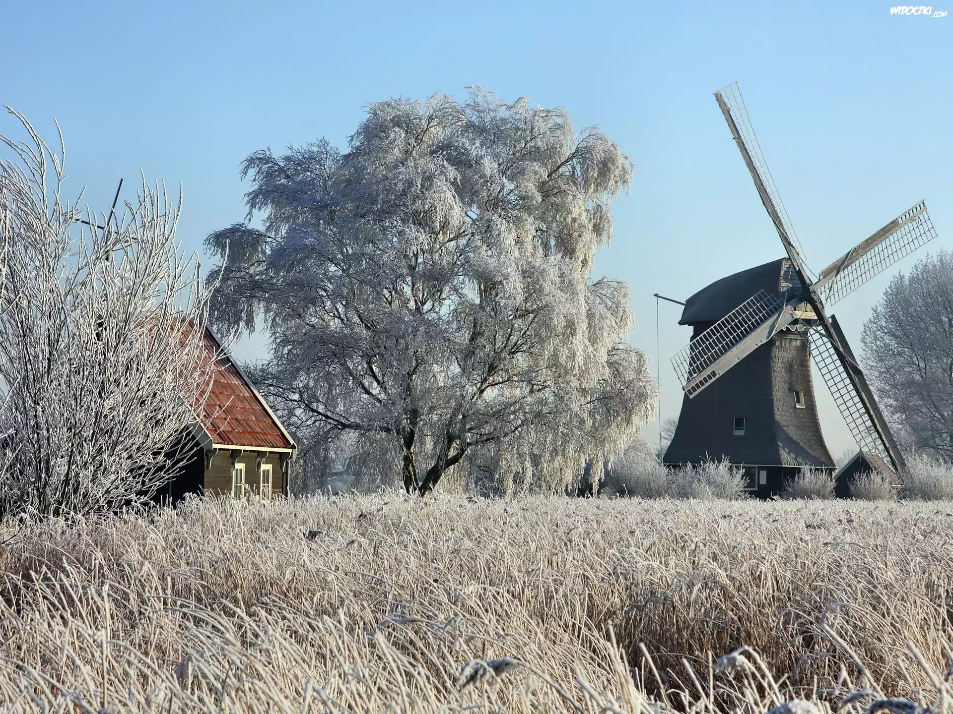 Wiatrak, Oszroniona, Trawa, Drzewa