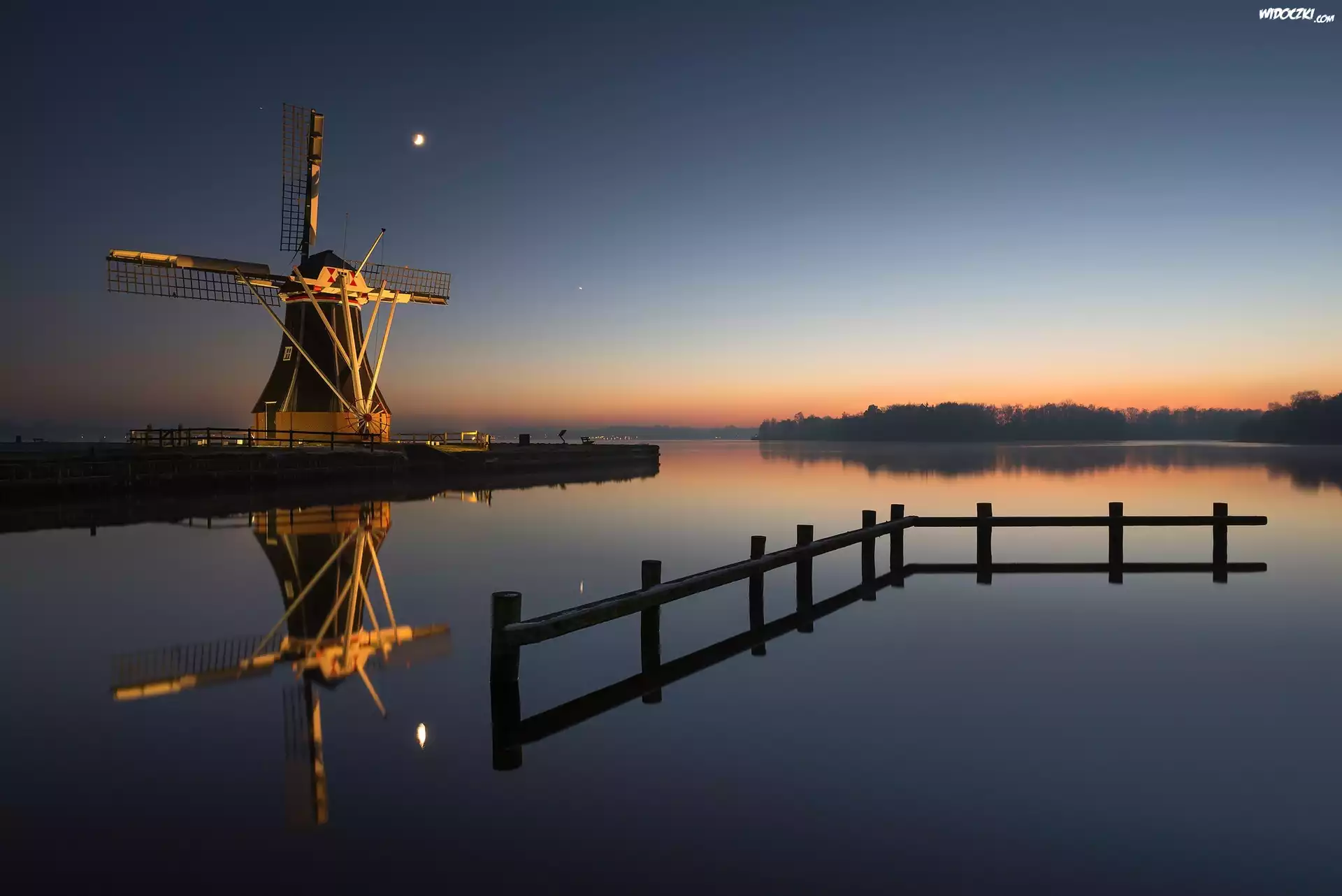 Zdjęcia, Wiatrak, Rzeka, Zmrok, Holandia
