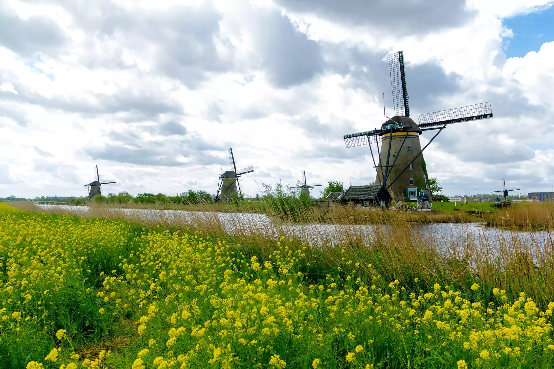 Zdjęcia, Wiatraki, Rzeka, Łąka, Kwiaty, Holandia, Wiosna