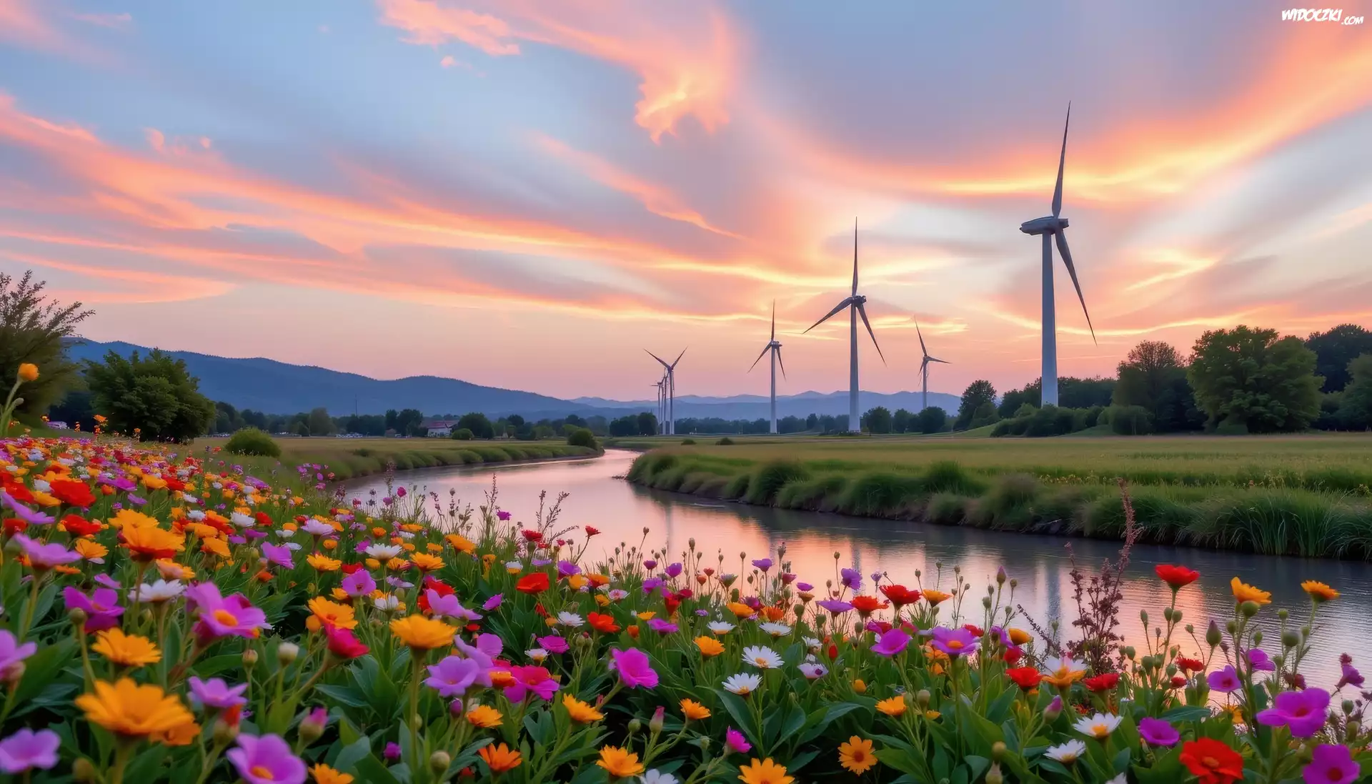 Rzeka, Łąka, Kwiaty, Wiatraki, Drzewa, Grafika AI