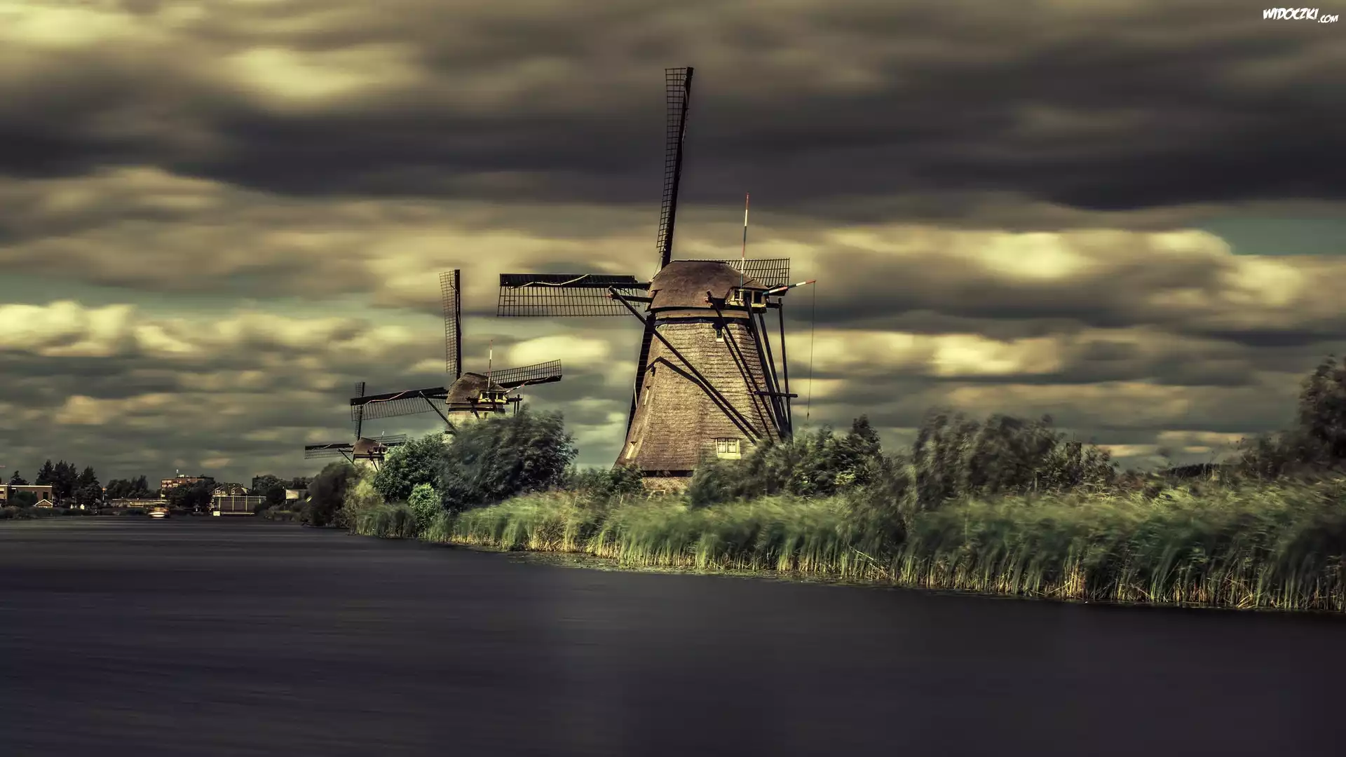Zdj臋cia, Wiatraki, Rzeka, Trawa, Niebo, Zachmurzome