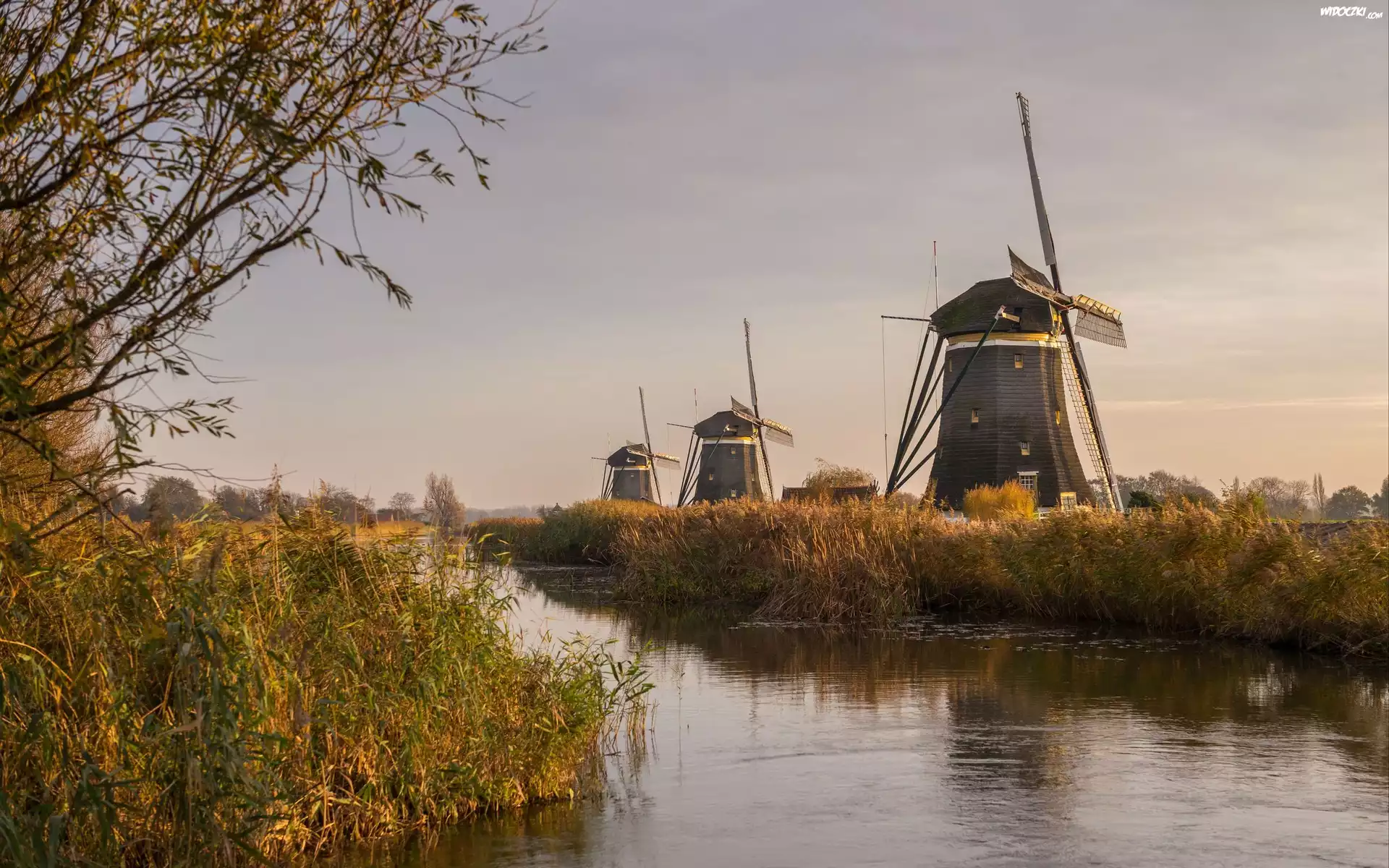 Zdjęcia, Wiatraki, Rzeka, Roślinność, Trawy