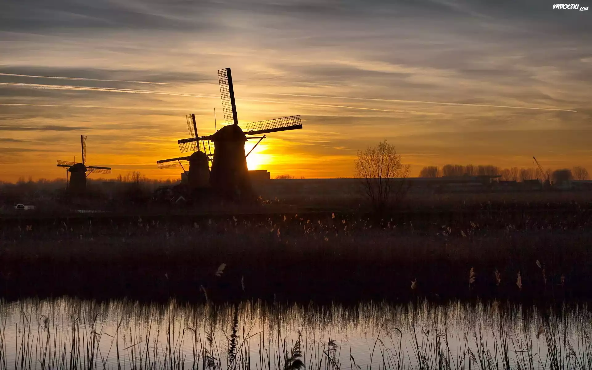 Wiatraki, Zachód, Słońca, Trawy