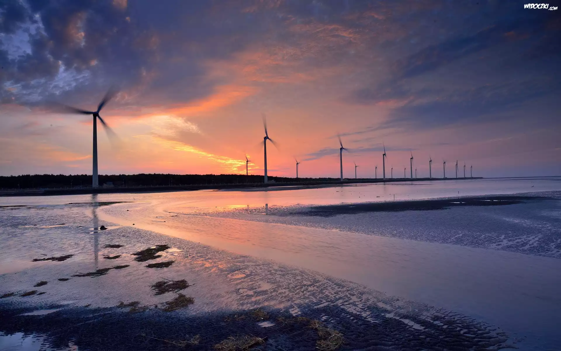 Zdjęcia, Wiatraki, Rzeka, Lasy, Zachód, Słońca