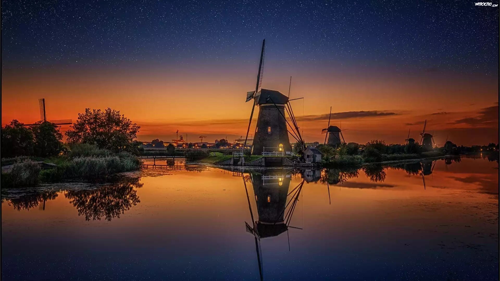 Zdjęcia, Wiatraki, Rzeka, Zachód, Słońca