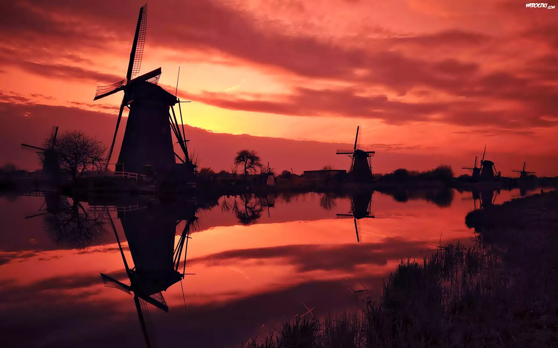 Zdjęcia, Wiatraki, Rzeka, Zachód, Słońca