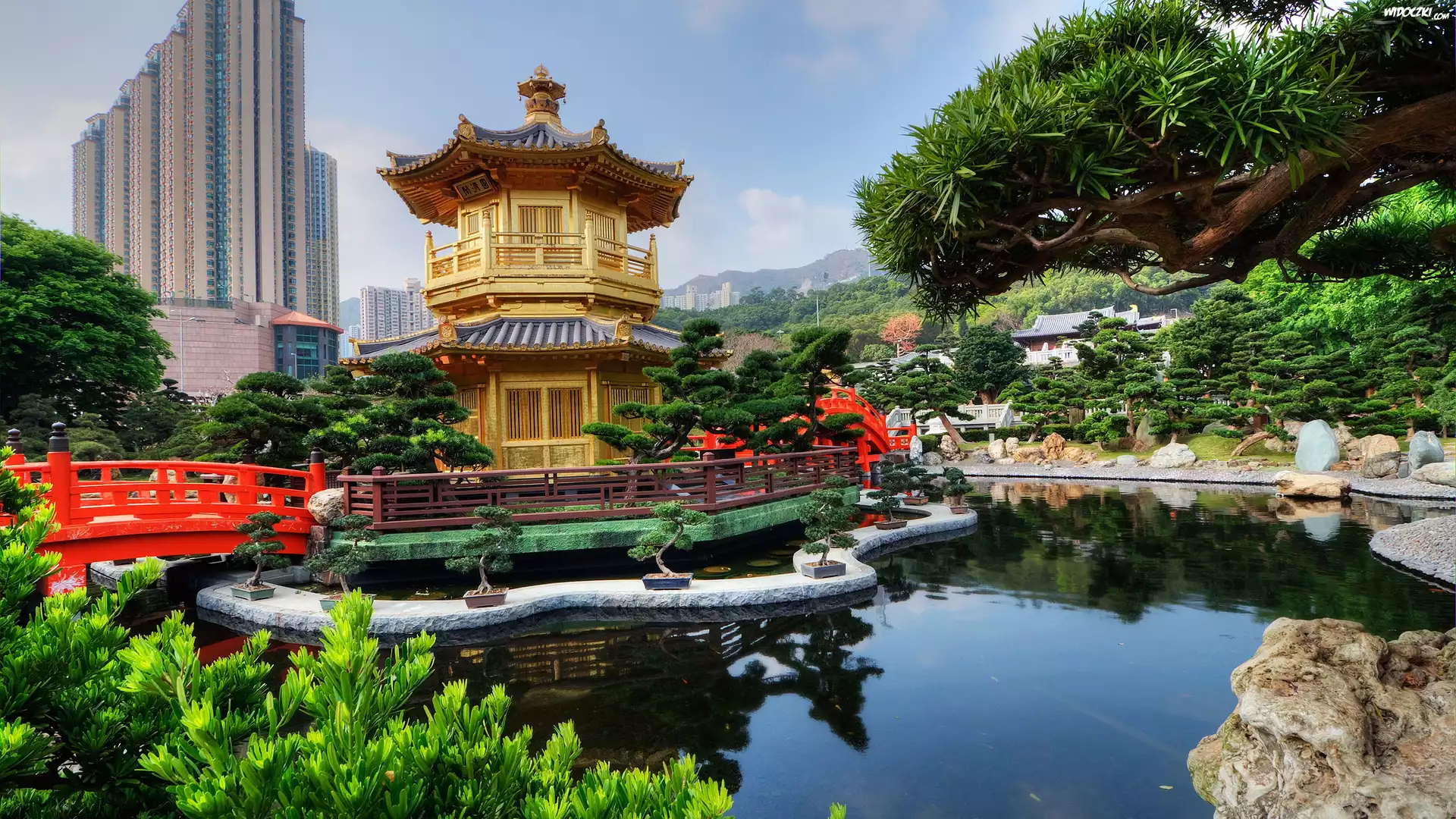 Świątynia, Golden Pavilion Chi Lin Nunnery Temple, Ogród, Chi Lin Nunnery, Staw, Most, Diamond Hill, Hongkong, Chiny |