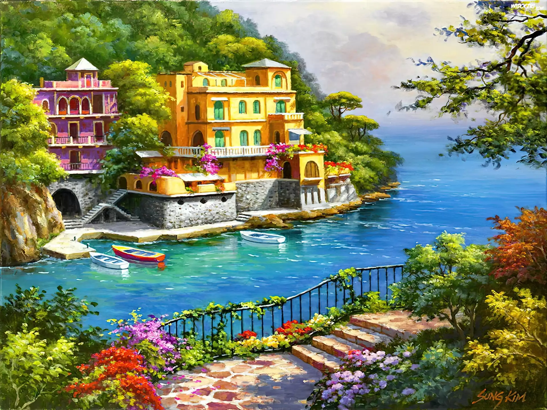 Zdjęcia, Widok, Zatoka, Wybrzeże, Domy, Kwiaty