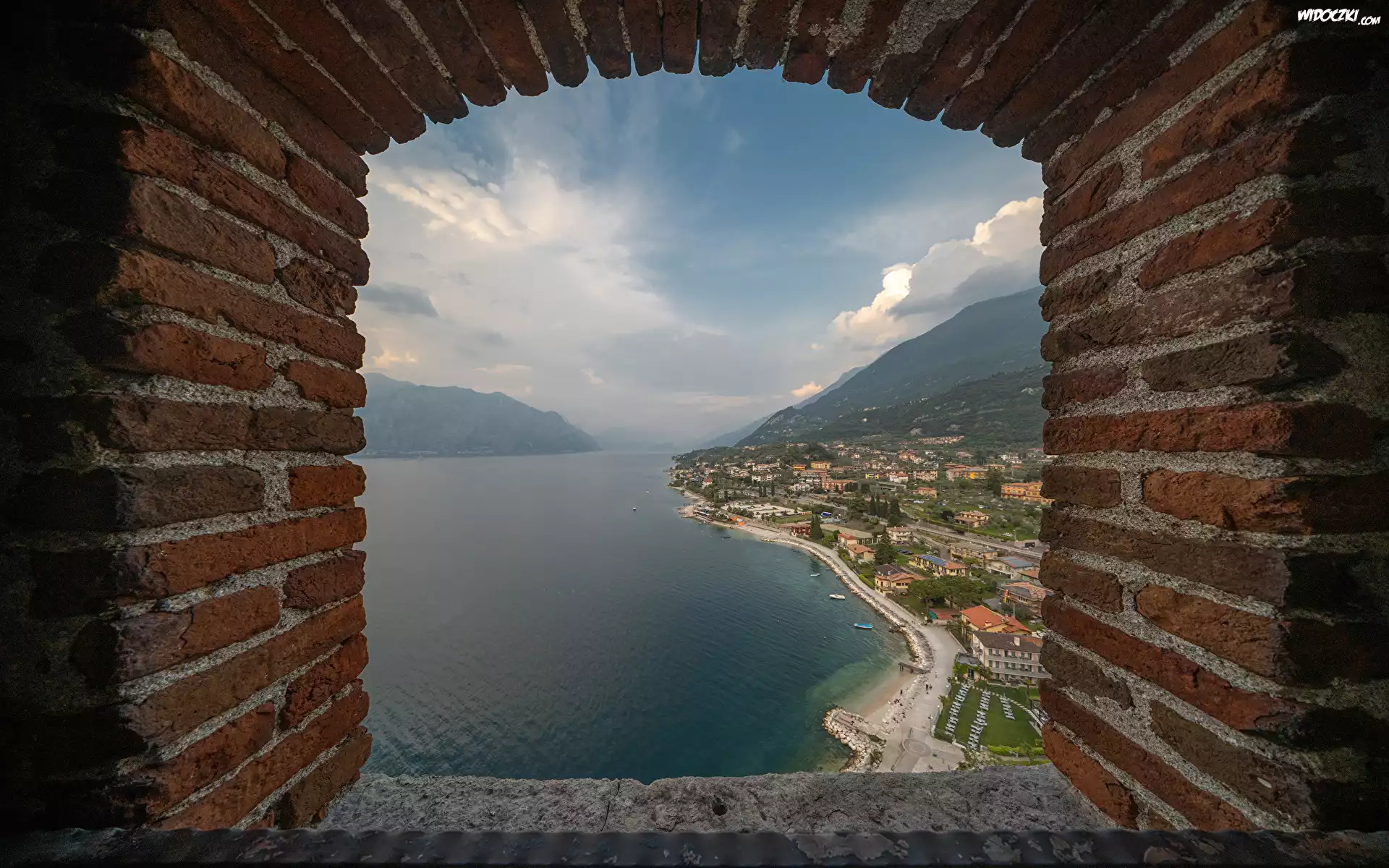 Włochy, Jezioro, Lago di Garda, Veneto, Widok, Niebo, Chmury, Okno, Mur