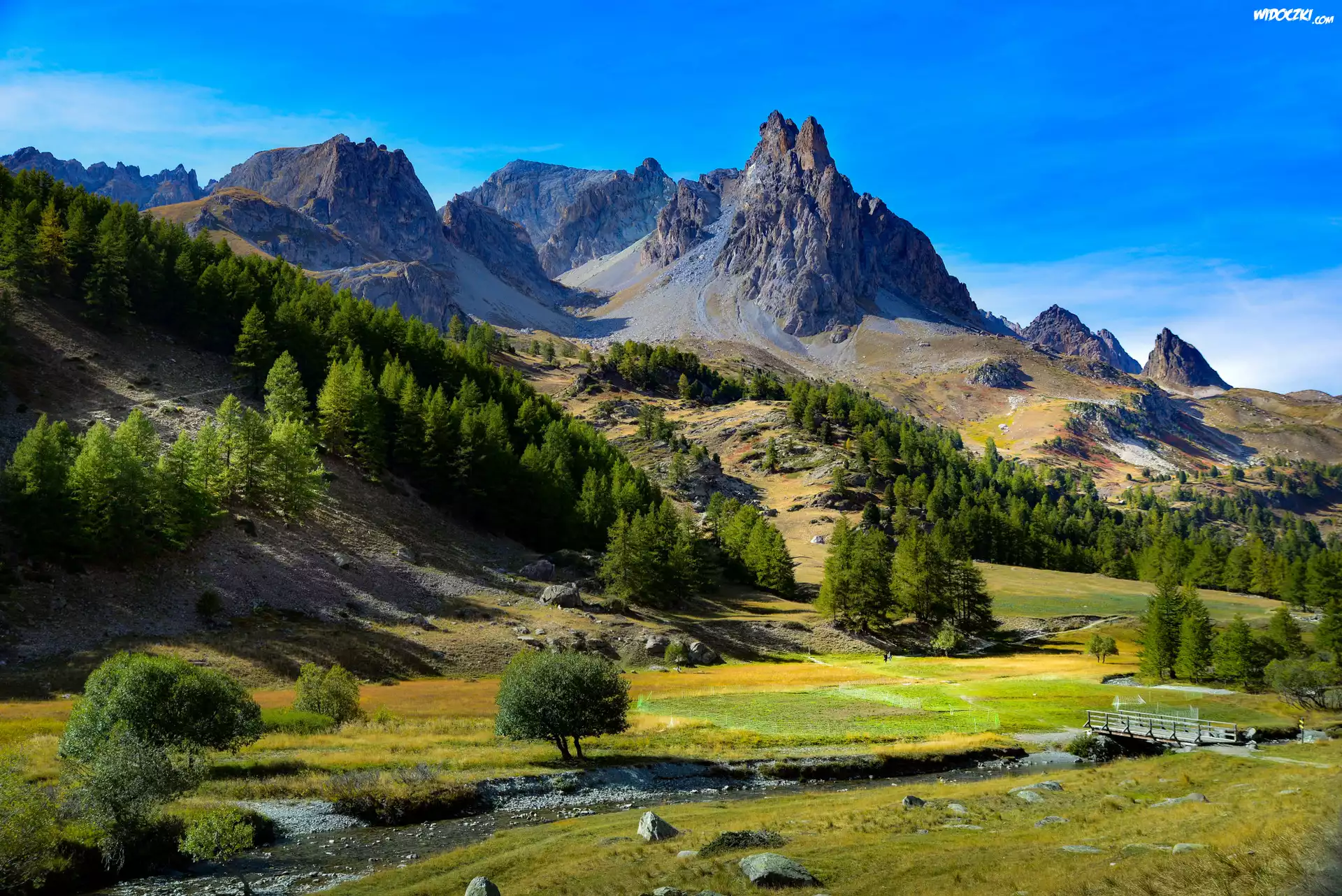 Widok, Góry, Skały, Drzewa, Rzeka, Mostek